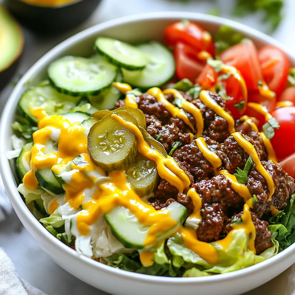 Presentation matters! Serve your burger bowls in clear glass or bright bowls. This way, all the colorful ingredients show off. You can also layer the salad base and toppings for a beautiful look. Garnish with fresh herbs like parsley or chives. This adds a pop of color and freshness. Drizzle your sauce on top just before serving for a tasty finish.