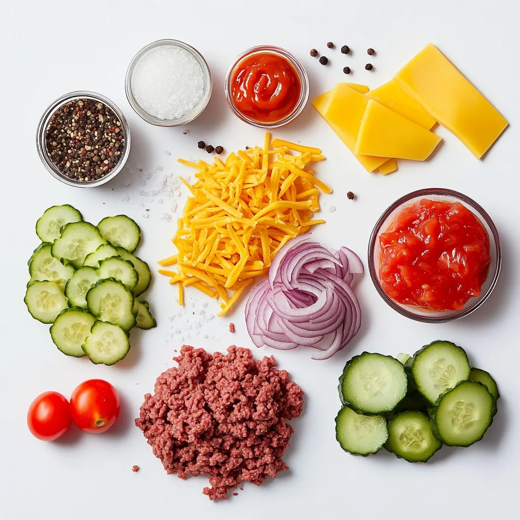 These ingredients make the base of your burger bowls. The ground meat gives it a hearty feel. Seasoning adds depth and flavor, while the fresh veggies bring crunch and color.