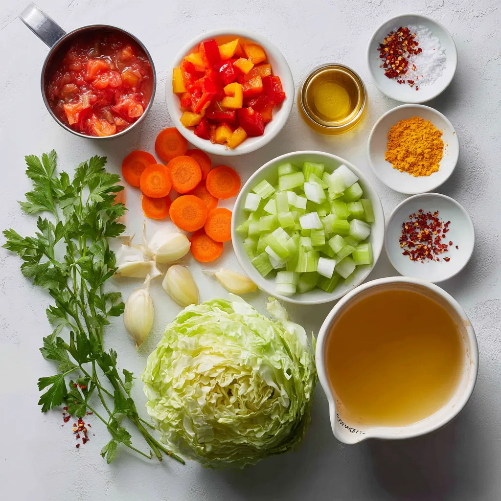 Start by gathering all your ingredients. You will need cabbage, onion, garlic, carrots, celery, bell pepper, diced tomatoes, vegetable broth, ginger, turmeric, olive oil, salt, and pepper.