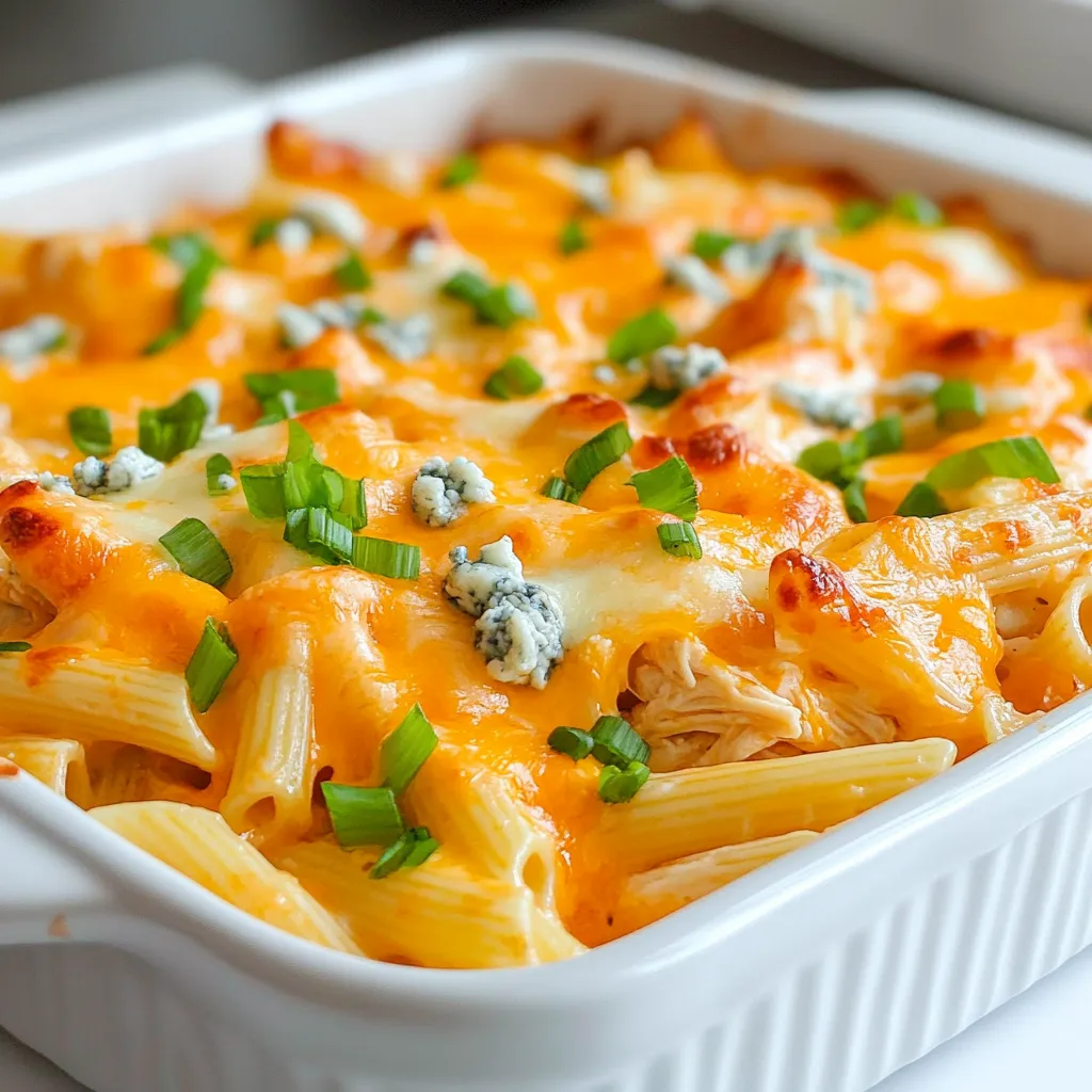 A delicious and creamy pasta bake featuring rotisserie chicken and a spicy Buffalo sauce, topped with melted cheese.