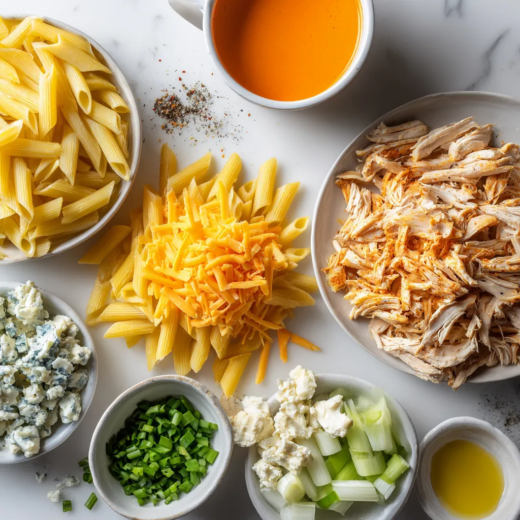 Gathering the right ingredients is key for this dish. Start with the cooked penne pasta and shredded rotisserie chicken. These make a strong base. The Buffalo sauce adds the spicy kick we love.