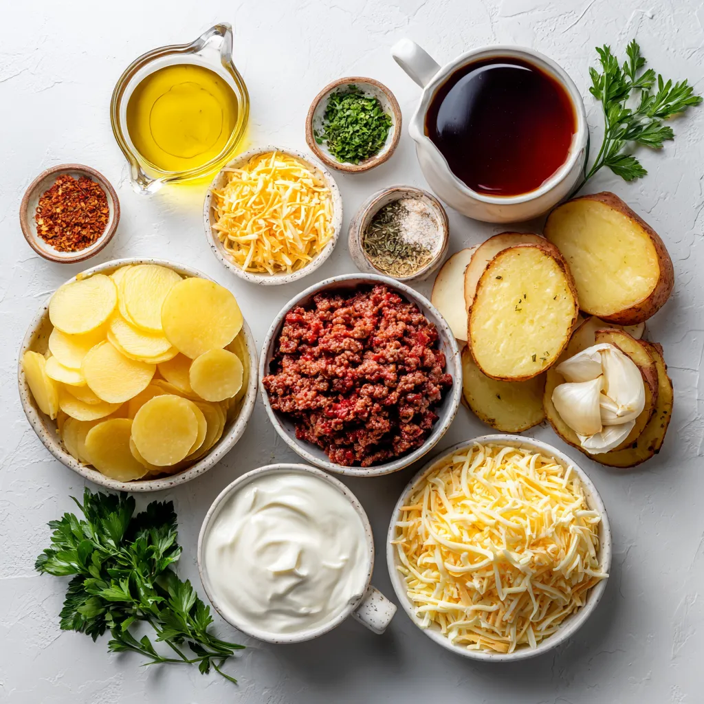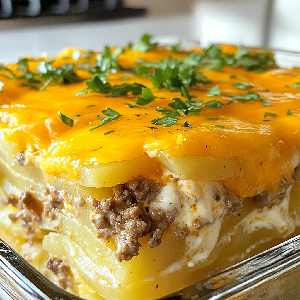 - 1 lb ground beef - 4 medium-sized russet potatoes, peeled and thinly sliced - 1 cup cheddar cheese, shredded - 1 cup mozzarella cheese, shredded The ground beef is the star here. It gives the casserole its rich flavor and hearty feel. I always choose a good quality beef for the best result. Potatoes add that comforting base. Use russet potatoes for their fluffiness. The cheeses bring creaminess and taste. Cheddar adds sharpness, while mozzarella gives that lovely stretch. - 1 medium onion, finely chopped - 2 cloves garlic, minced - 1 teaspoon paprika - 1 teaspoon dried oregano - Salt and pepper to taste Onion and garlic are essential for depth. They create a savory base that wakes up the flavors. I prefer finely chopping the onion for even cooking. Paprika brings warmth and a hint of smokiness. Oregano adds a fresh, herbal note. Don’t forget to season with salt and pepper. This will enhance the overall taste. - 1 cup sour cream - 1 cup beef broth - 2 tablespoons olive oil Sour cream adds creaminess and tang. It balances the richness of the cheese and beef. Beef broth gives moisture and depth. I always choose low-sodium broth to control salt levels. Olive oil is key for sautéing. It helps cook the onion and garlic until soft and fragrant. {{ingredient_image_1}} Preheating the Oven Start by preheating your oven to 375°F (190°C). This step is key. A hot oven ensures even cooking for your casserole. Sautéing Onion and Garlic In a large skillet, heat 2 tablespoons of olive oil over medium heat. Add 1 finely chopped onion and 2 minced garlic cloves. Stir them until the onions turn soft and clear. This mix adds great flavor to the beef. Browning the Beef Now, add 1 pound of ground beef to the skillet. Use a spatula to break it apart. Cook until it turns brown, which takes about 5-7 minutes. Make sure to drain any excess fat if you see it. Seasoning the Mixture As the beef cooks, season it with 1 teaspoon of paprika, 1 teaspoon of dried oregano, and a pinch of salt and pepper. Mix well to ensure every bite has rich flavor. Layering Potatoes and Beef In a greased 9x13-inch baking dish, start with half of the 4 medium-sized russet potatoes, thinly sliced. Spread these evenly at the bottom. Add a sprinkle of salt and pepper. Next, layer half of the cooked ground beef mixture over the potatoes. Adding the Sauces and Cheeses In a mixing bowl, combine 1 cup of sour cream and 1 cup of beef broth. Mix until smooth. Pour half of this mixture over the beef. Then, sprinkle half of the 1 cup of cheddar cheese and half of the 1 cup of mozzarella cheese on top. Repeat these layers with the remaining potatoes, beef, sauce, and cheeses. Finish with the rest of the cheese on top for that gooey finish. Ensuring Tender Potatoes To get tender potatoes, slice them thinly. Thin slices cook faster and absorb flavors better. You can soak them in cold water for 30 minutes to help remove excess starch. This step keeps them from turning mushy. Tips for Cheesy Texture For that creamy, cheesy goodness, mix both cheddar and mozzarella. Cheddar gives a sharp flavor, while mozzarella adds stretchiness. Layer the cheese between the potato and meat layers. This keeps it rich and melty. Adjusting Baking Times Baking times can change based on your oven. If your casserole is not bubbling after 30 minutes, check it. The potatoes should be fork-tender. You can cover it with foil if it browns too fast. Using a Thermometer Using a thermometer can help you check the doneness. The internal temp should reach 160°F (71°C) for the beef to be safe. This ensures your meal is not just tasty, but safe to eat. Garnishing Ideas Fresh parsley adds color and freshness. Sprinkle it on just before serving. You can also use chives or green onions for a nice crunch. Serving Suggestions Serve the casserole with a simple salad. A light green salad pairs well with the cheesy richness. You can also offer crusty bread for a comforting meal. Pro Tips Use Starchy Potatoes: Russet potatoes are ideal for casseroles due to their high starch content, which helps achieve a fluffy texture. Layering for Flavor: Ensure you layer the ingredients evenly to allow the flavors to meld beautifully throughout the casserole. Customize Your Cheese: Feel free to mix different types of cheese, such as pepper jack or gouda, for a unique twist on the traditional flavor. Let it Rest: Allow the casserole to rest for about 10 minutes after baking. This helps the layers set and makes serving easier. {{image_2}} Alternative Proteins You can swap ground beef for other meats. Ground turkey or chicken works well. If you want to keep it light, try using ground lamb. For a plant-based option, use lentils or crumbled tempeh. Dairy-Free Options If you're dairy-free, consider using cashew cream instead of sour cream. For cheese, look for dairy-free shreds made from nuts or soy. This keeps the dish creamy without the dairy. Gluten-Free Adaptations This casserole is easy to make gluten-free. Just ensure that your broth and any cheese used are gluten-free. Always check labels to be safe. Vegetarian or Vegan Versions For a vegetarian version, skip the meat and add more veggies. You can use mushrooms and bell peppers. To make it vegan, replace sour cream with a plant-based option and use vegan cheese. Adding Vegetables You can add veggies for more flavor and nutrients. Consider adding spinach, zucchini, or bell peppers. Just chop them small so they mix well. Spicing It Up If you like heat, add red pepper flakes or a dash of hot sauce. You can also change the seasonings to suit your taste. Try adding cumin or chili powder for a different twist. Refrigeration Guidelines Let your casserole cool down first. Then, cover it tightly with plastic wrap or foil. Store it in your fridge for up to three days. This keeps it fresh and tasty for later meals. Freezing the Casserole If you want to keep it longer, freezing is a great option. Cut the casserole into individual portions. Wrap each piece in p