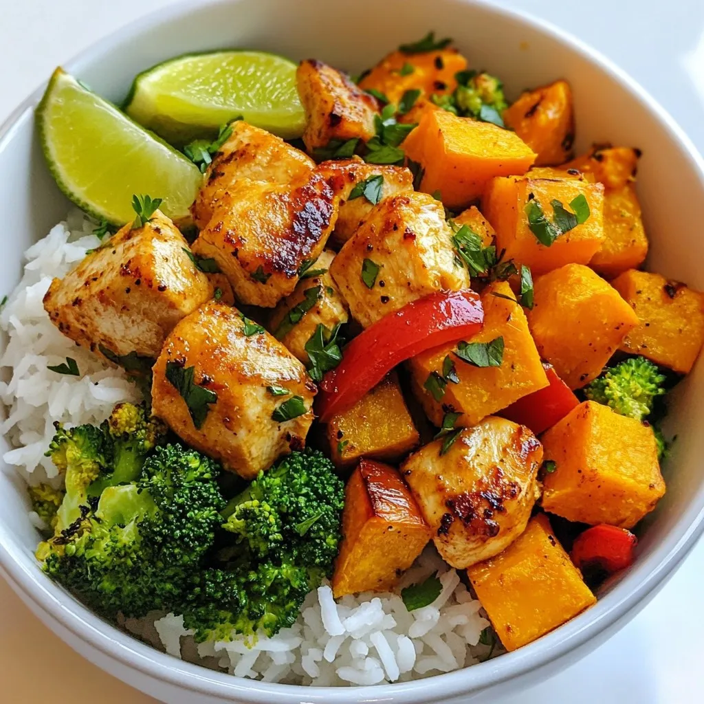 A delicious and nutritious rice bowl featuring tender chicken, roasted sweet potatoes, and vibrant vegetables.