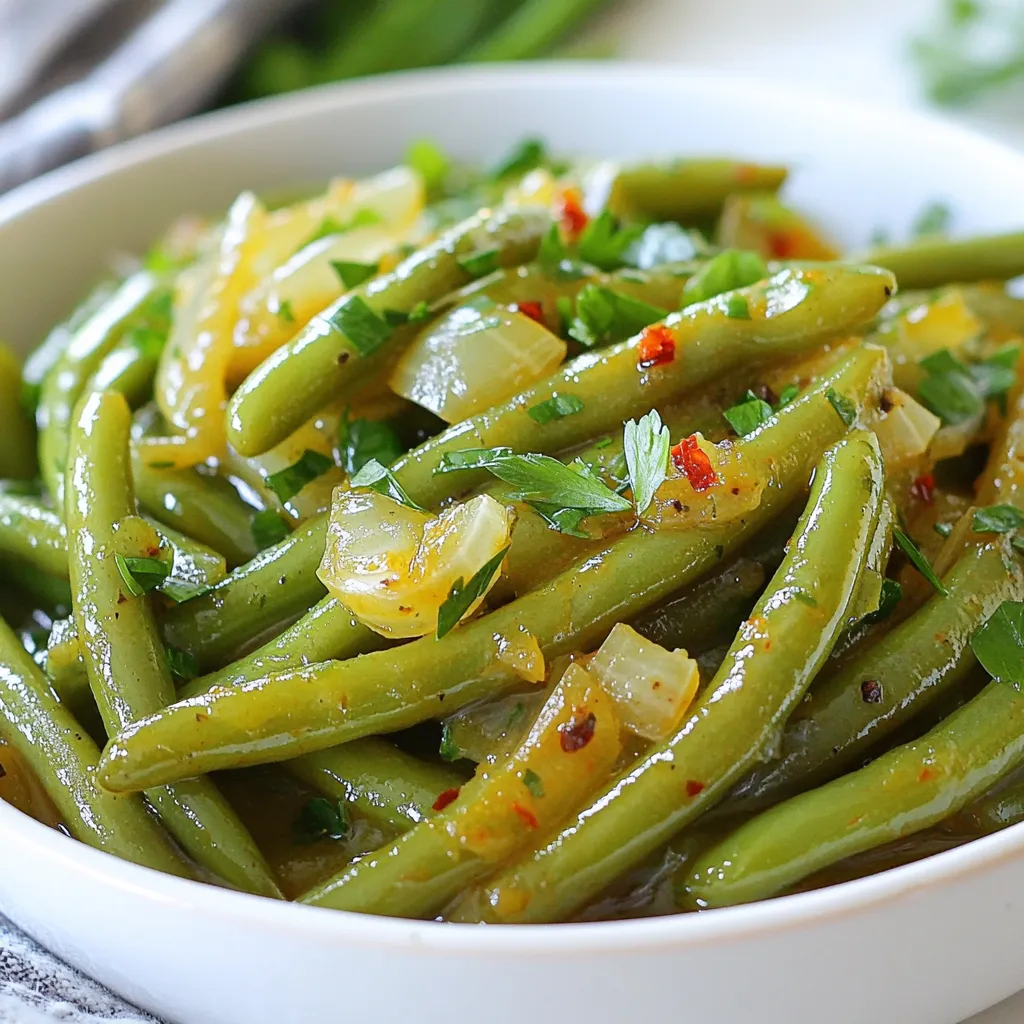 Want to kick up the heat? Try this spicy version. Start by adding more crushed red pepper flakes. You can add up to a full teaspoon for a fiery taste. If you love heat, consider including fresh jalapeños. Just slice them thin and add them when you sauté the onions. This will give your green beans a nice spicy bite.