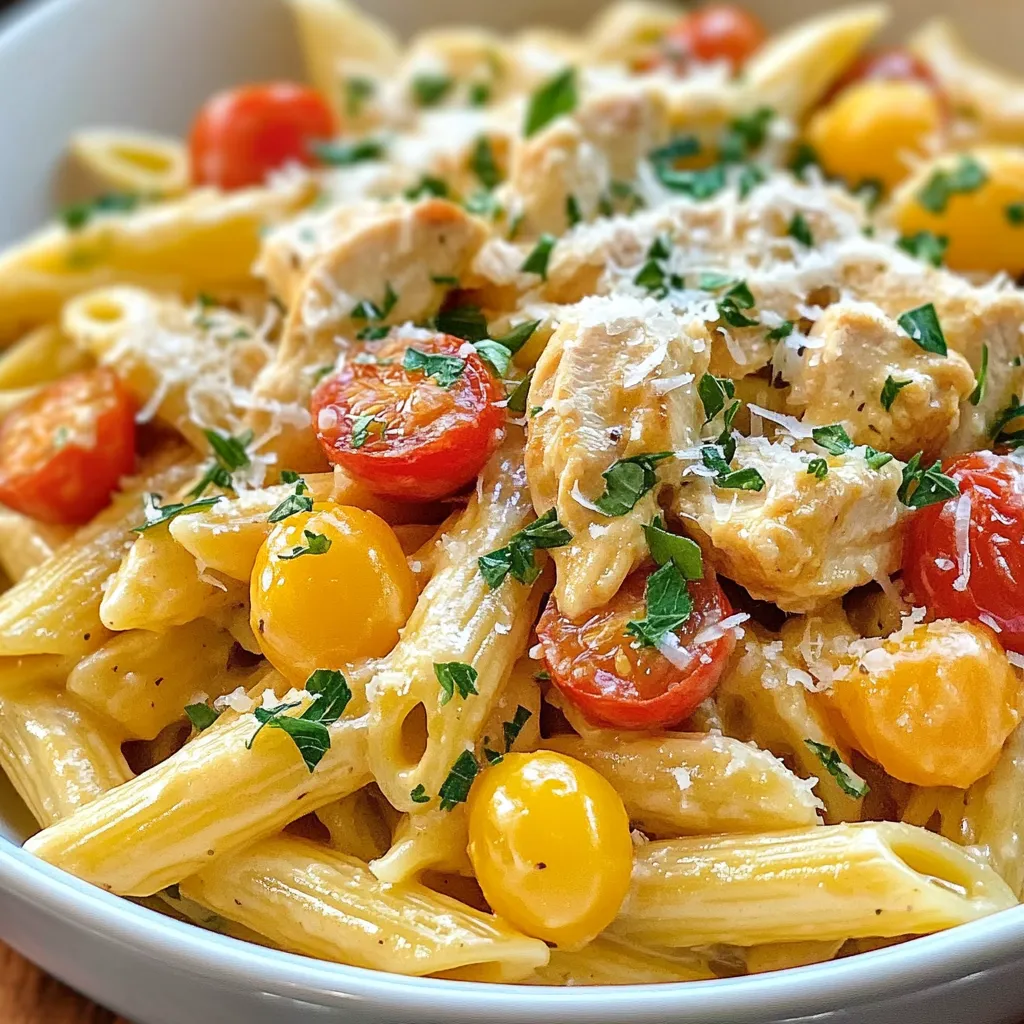 Once the chicken is cooked, stir in 1 cup of heavy cream. Bring this mixture to a gentle simmer. Then, add 1 cup of grated Parmesan cheese and 1 cup of halved cherry tomatoes. Stir everything together until the cheese melts and the sauce thickens, about 3-4 minutes. Finally, add the cooked penne pasta to the skillet. Toss it all together to combine evenly. If the sauce is too thick, add a splash of pasta water. This helps reach the right consistency. Remove from heat and garnish with 1 tablespoon of chopped fresh parsley before serving.