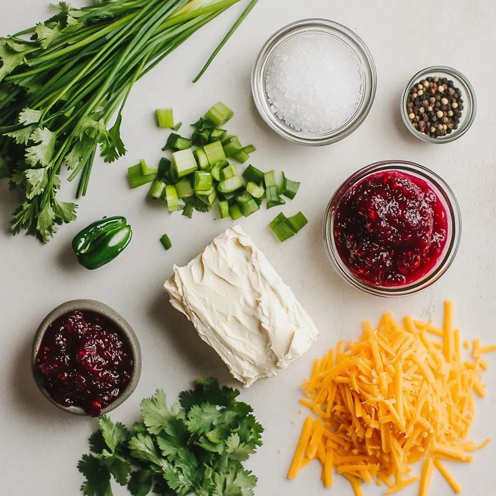 This dip starts with cream cheese. It gives a smooth and rich base. Next, we add cranberry sauce. This brings a sweet and tangy flavor. The jalapeño adds a nice kick. Remember to remove the seeds for less heat. Green onions add freshness and crunch. Garlic powder, salt, and black pepper enhance the taste.