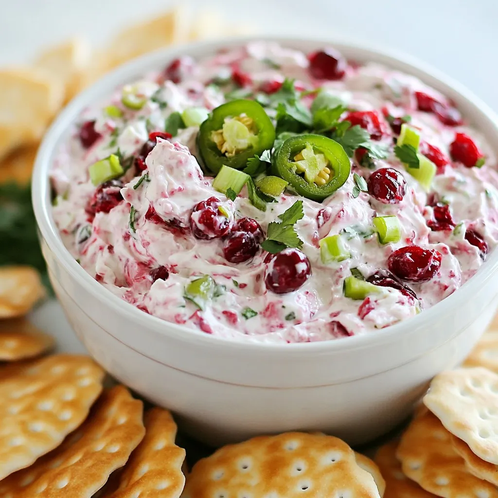 A creamy and spicy dip featuring cranberry and jalapeño, perfect for gatherings.