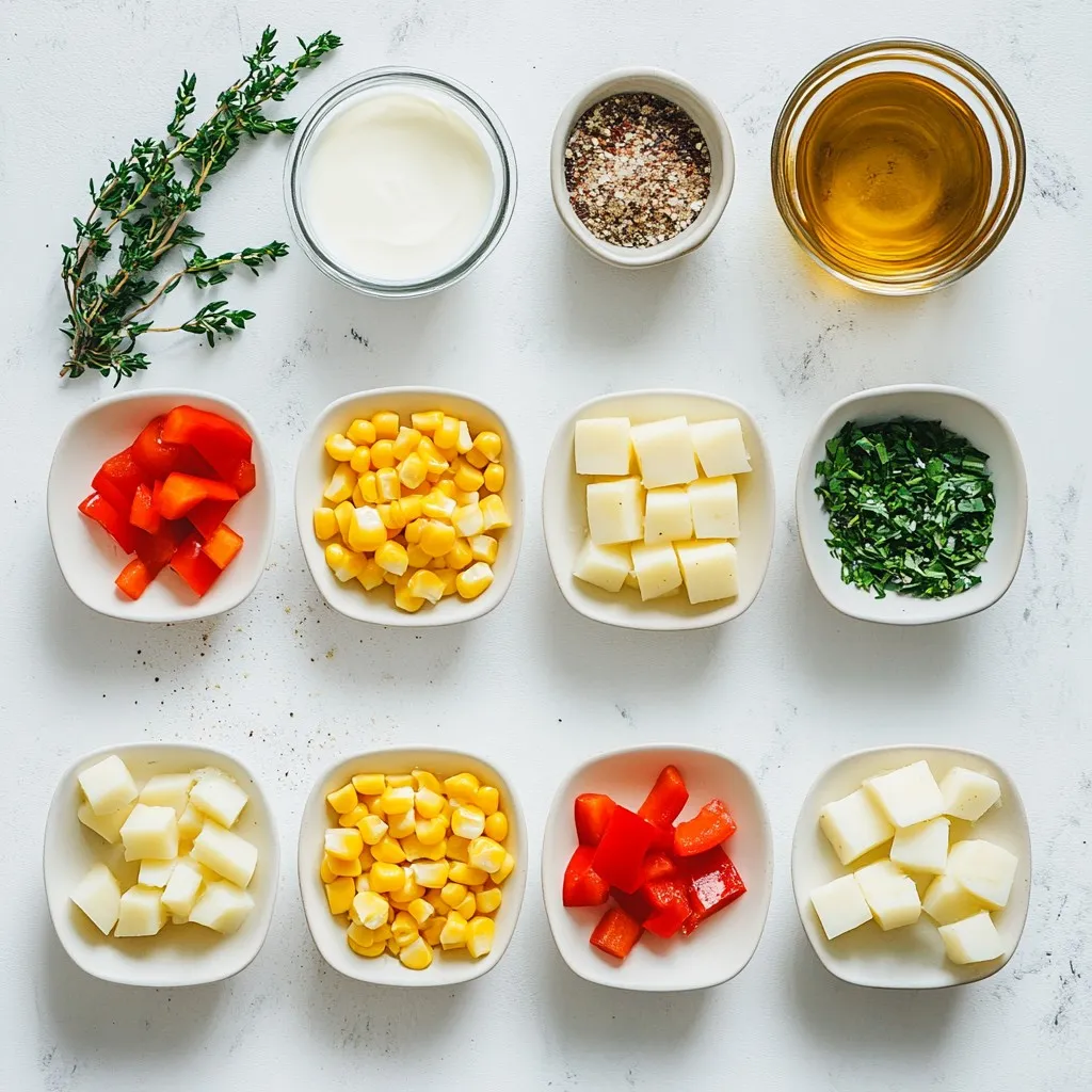 First, gather your ingredients. You need fresh corn, onion, potatoes, and red bell pepper. Chop the onion finely. Dice the potatoes and bell pepper. Mince the garlic cloves. This setup makes cooking easier.