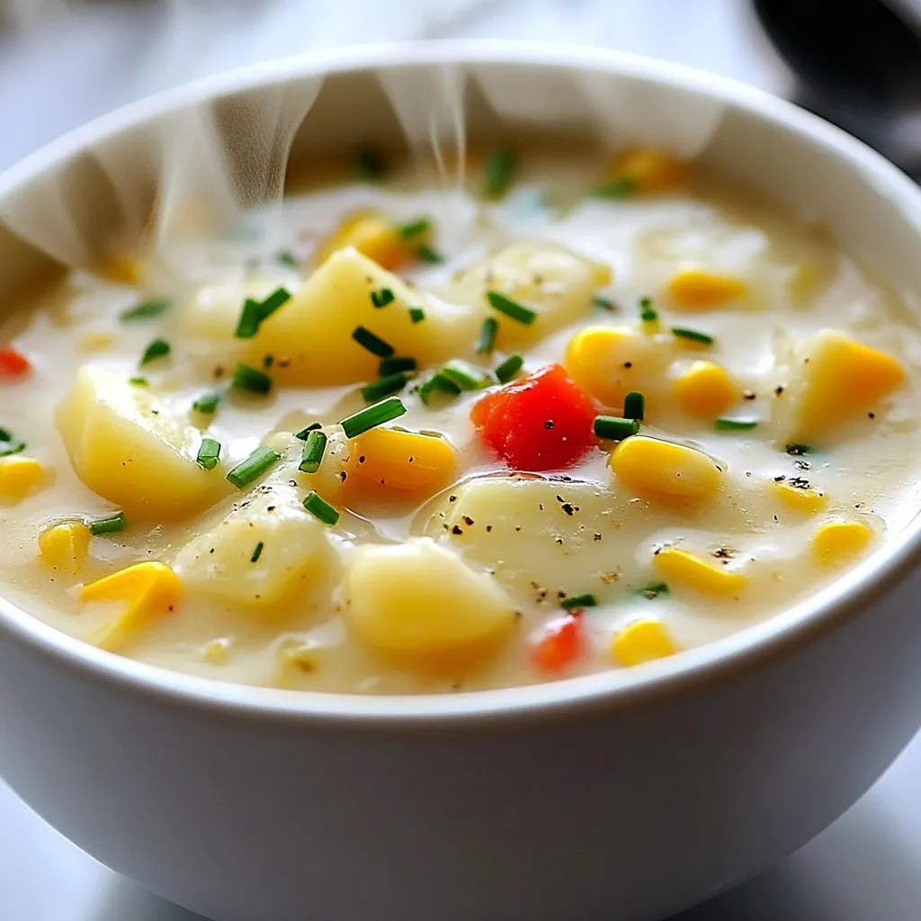 A creamy and hearty chowder made with fresh corn, potatoes, and bell peppers, perfect for a comforting meal.