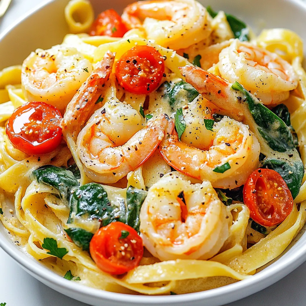 It’s time to add some color and flavor! Toss in 1 cup of halved cherry tomatoes and 2 cups of fresh spinach. Stir until the spinach wilts. Now, season the sauce with salt and pepper to taste. Finally, add the cooked pasta and shrimp to the sauce. Toss everything together until well coated. Warm it through for about 2 to 3 minutes.