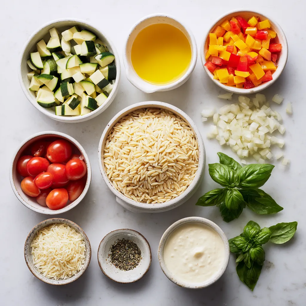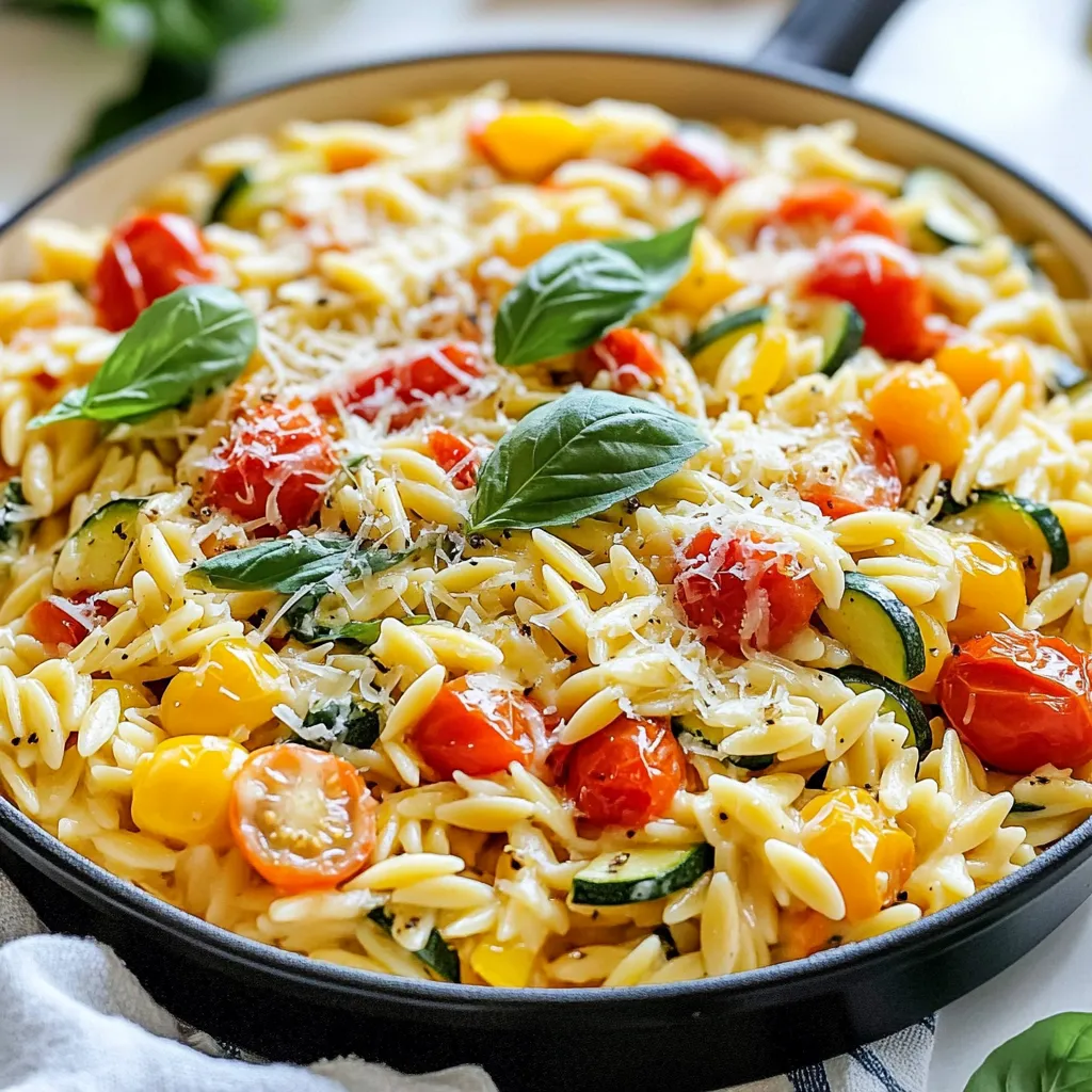 A delicious and creamy one-pot meal featuring orzo pasta and fresh vegetables.
