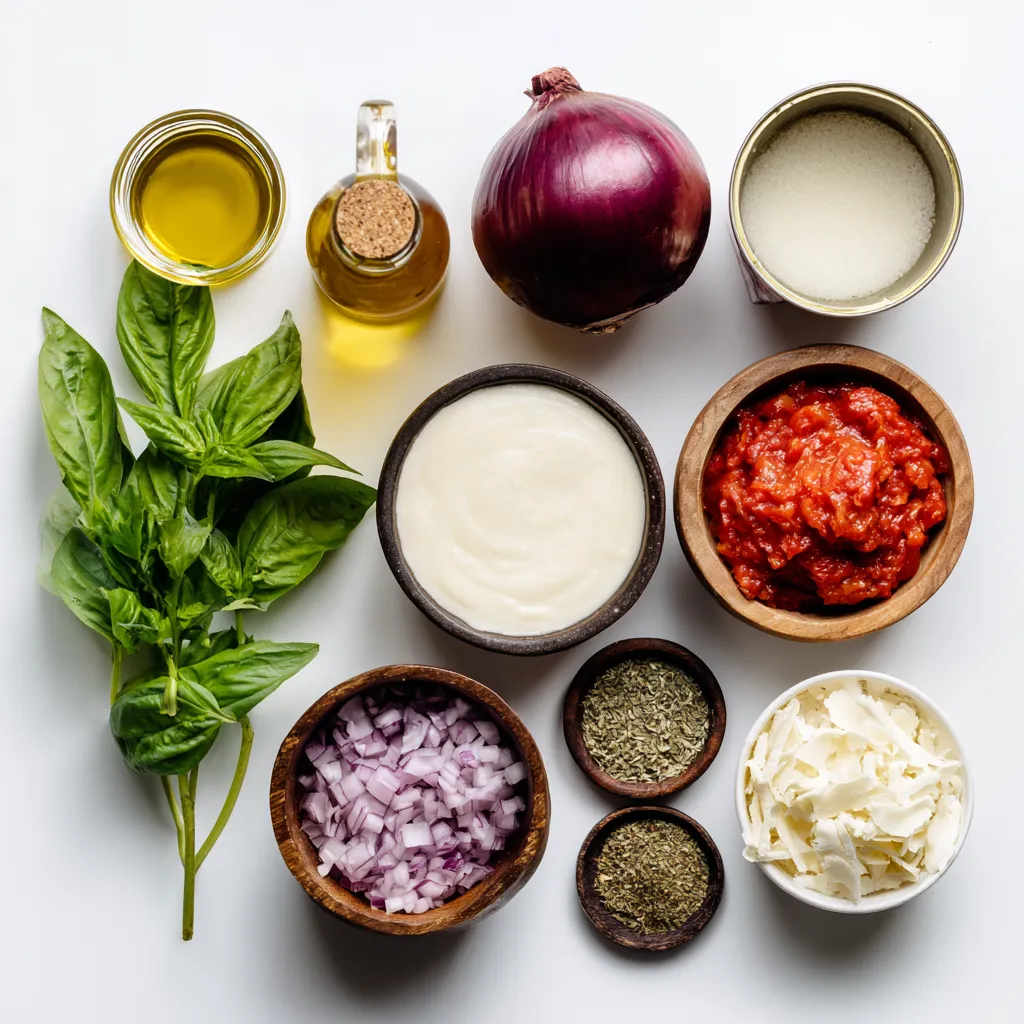 1. Gather your ingredients. You need olive oil, onion, garlic, diced tomatoes, broth, herbs, sugar, and cream.
