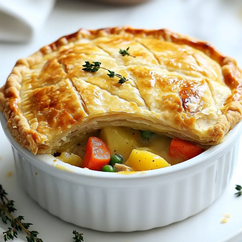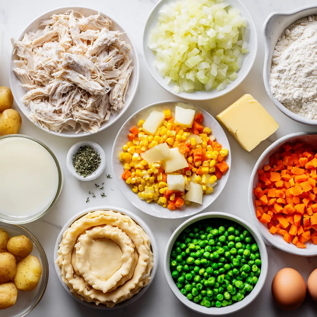 - 2 cups cooked chicken, shredded - 1 cup frozen mixed vegetables (peas, carrots, corn) - 1/2 cup diced potatoes, boiled until tender - 1/2 cup onion, chopped - 1/2 cup celery, chopped - 1/4 cup butter - 1/4 cup all-purpose flour - 1 cup chicken broth - 1 cup milk - 1 teaspoon garlic powder - 1 teaspoon thyme - Salt and pepper to taste - 2 pre-made pie crusts (store-bought or homemade) - 1 egg, beaten (for egg wash) Each item plays a key role in making the pot pie warm and tasty. The cooked chicken brings protein. The mixed vegetables add color and nutrients. Diced potatoes give it heartiness. Onions and celery create a great flavor base. Butter and flour make a smooth sauce. Chicken broth and milk help bind it all together. Seasonings like garlic powder and thyme boost the taste. The pie crust wraps everything in a flaky hug. Lastly, the egg wash gives a shiny look. {{ingredient_image_1}} 1. Start by melting the butter in a large skillet over medium heat. 2. Add the chopped onion and celery. Sauté them for about 5 to 7 minutes. They should be soft and clear. 3. Next, stir in the flour and cook for one minute. This forms a roux. 4. Slowly whisk in the chicken broth and milk. Make sure there are no lumps. 5. Add garlic powder, thyme, salt, and pepper to taste. 6. Bring this mix to a gentle simmer. Let it thicken for about 5 minutes. 7. Once thick, stir in the cooked chicken, mixed vegetables, and boiled potatoes. Remove from heat and set aside. 1. Roll out one pie crust on a clean surface. Fit it into a 9-inch pie dish. 2. Pour the chicken filling into the bottom crust. 3. Roll out the second pie crust. Place it over the filling. 4. Crimp the edges to seal the pie. Make slits in the top for steam to escape. 1. Brush the top crust with the beaten egg for a nice golden finish. 2. Bake in the preheated oven at 425°F (220°C) for 30 to 35 minutes. 3. Look for a golden brown crust and bubbly filling to know it's ready. 4. Once done, let the pie cool for 10 minutes before slicing. - How to achieve a flaky crust To get a flaky crust, keep your ingredients cold. Use chilled butter and cold water. When mixing, work quickly. Don’t over-knead the dough. Use a light touch to keep air pockets. - Adjusting seasonings to taste Taste your filling before baking. Add more salt, pepper, or herbs if needed. Garlic powder and thyme bring great flavor. Adjust these based on your preference. A little extra spice can make a big difference. - Ensuring even cooking Preheat your oven to 425°F (220°C). This helps the crust bake evenly. Make sure to cut slits in the top crust. This allows steam to escape and stops sogginess. - Using store-bought ingredients To save time, use pre-made pie crusts. You can also buy rotisserie chicken. This cuts down on cooking and prep time. Frozen mixed veggies make it quick and easy. - Preparing filling ahead of time You can make the filling a day ahead. Store it in the fridge. When you're ready to bake, just pour it into the crust. This makes your meal prep much easier. Pro Tips Use Rotisserie Chicken: For a quicker prep time, consider using store-bought rotisserie chicken. It adds great flavor and saves you the step of cooking the chicken yourself. Thicken the Filling: If you prefer a thicker filling, allow it to simmer a bit longer before pouring it into the crust. Just be careful not to let it get too thick to pour. Egg Wash for Shine: Brushing the top crust with beaten egg not only gives it a beautiful golden color but also adds a slight sheen that makes your pie look professional. Let it Rest: Allow the pie to cool for at least 10 minutes after baking. This resting period helps the filling set, making it easier to slice and serve. {{image_2}} You can easily change up the veggies in your pot pie. Try using fresh spinach, green beans, or even mushrooms. Each vegetable brings a new taste. Adding herbs and spices can make your pie even better. Try rosemary or basil for a fresh kick. A pinch of paprika can also add warmth. If you need a gluten-free option, look for gluten-free pie crusts. Many stores sell them now. You can also make your own crust with almond flour or rice flour. For a dairy-free filling, use almond milk or coconut milk instead of regular milk. You can also swap butter for olive oil or vegan butter. These changes keep the pie tasty for everyone. After you enjoy your double crust chicken pot pie, store any leftovers properly. Keep the pie in the fridge if you plan to eat it soon. Use an airtight container or cover it tightly with plastic wrap. This helps the pie stay fresh and tasty. Consume the leftovers within three days for the best flavor. If you want to keep it longer, freezing is a great option. First, let the pie cool completely. Then wrap it tightly in plastic wrap. After that, place it in a freezer-safe bag or container. This will keep it safe for up to three months. When you're ready to eat, you can thaw it in the fridge overnight. When it’s time to enjoy your leftover chicken pot pie, reheating is key. The best method is to use the oven. Preheat your oven to 350°F (175°C). Place the pie on a baking sheet to catch any drips. Heat it for about 20-30 minutes. This will warm the filling and crisp the crust. If you're short on time, a microwave works too. Just be sure to cover the pie with a damp paper towel. This keeps the moisture in and prevents the crust from getting too hard. Microwaving might not make the crust crisp, but it will be quick and easy. No matter how you reheat it, check that the filling is hot. This ensures the pie stays delicious and safe to eat. It takes about one hour to make this pot pie. You will spend 20 minutes prepping and 30 to 35 minutes baking. This quick time makes it a great meal for busy days. Yes, you can use leftover chicken! It is a great way to use what you have. Just shred the chicken into small pieces. This will save you time and add extra flavor to your pot pie. Some great side dishes are: - Simple green salad - 