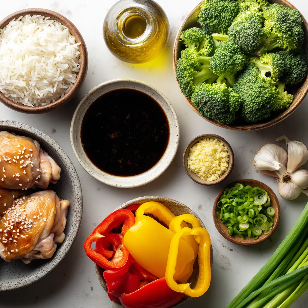 Gather these ingredients for a quick and easy meal. The chicken gives you a great base. The teriyaki sauce adds a sweet and salty flavor. Ginger and garlic bring warmth to the dish. The broccoli and bell peppers add color and crunch.