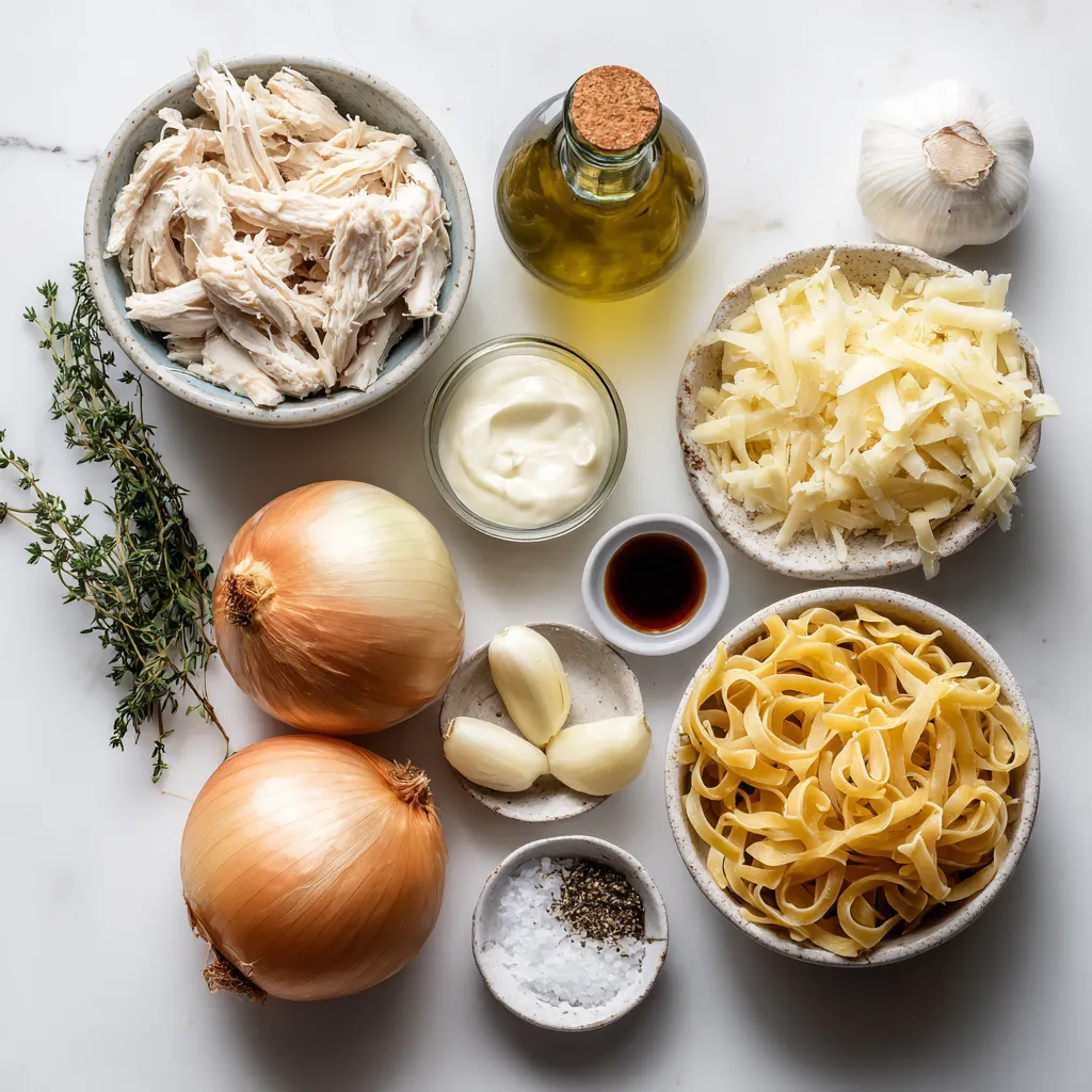 - 2 cups cooked chicken, shredded - 2 large onions, thinly sliced - 8 ounces egg noodles (uncooked) - 1 cup low-sodium chicken broth - 1 tablespoon Worcestershire sauce - 1 teaspoon thyme - Salt and pepper to taste - 1 cup sour cream - 1 cup shredded Swiss cheese - 1 cup French fried onions - 2 tablespoons olive oil Gathering the right ingredients is key to a great dish. I love using tender, cooked chicken to give this casserole its hearty base. Shredded chicken blends well with the other flavors. Next, the onions bring sweetness and depth. Slice them thinly, so they caramelize nicely. Egg noodles add a comforting texture. Cook them al dente, as they will soak up some broth and flavors during baking. For seasonings, I prefer low-sodium chicken broth for a lighter taste. Worcestershire sauce adds a hint of tang. Thyme gives a lovely earthiness. Don't forget salt and pepper! They enhance all the flavors in the dish. Dairy adds richness. Sour cream makes it creamy and smooth. Swiss cheese melts beautifully on top, while French fried onions give a satisfying crunch. Use olive oil to caramelize the onions; it adds flavor and helps them cook evenly. These ingredients come together to create a warm and filling meal. Get ready to enjoy some comfort on your plate! {{ingredient_image_1}} - Preheat your oven to 350°F (175°C). This makes sure your casserole cooks evenly. - Caramelizing the onions and garlic is the next step. In a large skillet, heat 2 tablespoons of olive oil over medium heat. Add the thinly sliced onions. Stir them often so they don’t burn. Cook for about 15 to 20 minutes until they turn golden brown. Add 3 minced cloves of garlic and cook for another 1 to 2 minutes. The sweet smell will fill your kitchen! - In a large mixing bowl, combine 2 cups of shredded chicken, 1 cup of low-sodium chicken broth, 1 cup of sour cream, 1 tablespoon of Worcestershire sauce, 1 teaspoon of thyme, salt, and pepper to taste. Mix it well until all ingredients blend nicely. - Next, cook 8 ounces of egg noodles following the package instructions until they are al dente. Drain the noodles and add them to the chicken mixture. Stir until everything is well combined and ready for the next step. - Now, it’s time to fold in the caramelized onions and half of the shredded Swiss cheese into the chicken mixture. This adds great flavor and texture. - Transfer the mixture into a lightly greased 9x13 inch casserole dish. Top it with the remaining Swiss cheese and 1 cup of French fried onions. This will give a nice crunch. - Finally, bake in the preheated oven for 25 to 30 minutes. Look for melted cheese that is bubbly and a golden brown top. Once it’s done, take it out and let it cool for about 5 minutes before serving. Enjoy the rich flavors and comforting warmth of your French Onion Chicken Casserole! To get the best caramelized onions, start by slicing the onions thin. Use medium heat and add olive oil. Stir often for even cooking. Keep an eye on the time; it should take about 15 to 20 minutes. You want them golden and sweet. When you add garlic, do it last. Garlic cooks fast. Just one to two minutes is enough. This way, it won’t burn and can add great flavor. For the perfect creaminess in your casserole, you can adjust the amount of sour cream. If you want it creamier, add more. For a lighter version, use less. Cook the egg noodles until they are al dente. This means they should be firm but not hard. This helps the noodles hold up in the casserole when baked. To boost the flavor, try adding herbs like rosemary or parsley. A pinch of paprika can also give it some kick. You might also like to sprinkle some black pepper for extra spice. For sides, consider serving the casserole with a simple green salad. A light vinaigrette pairs nicely and balances the richness of the dish. Enjoy the comfort and flavors! Pro Tips Caramelize Onions Properly: Take your time to cook the onions until they're deeply golden brown for maximum flavor. This will add a rich sweetness to the casserole. Use Leftover Chicken: This recipe is perfect for using up leftover roasted or rotisserie chicken, making it a convenient and economical meal option. Customize with Vegetables: Feel free to add vegetables like spinach or mushrooms to the mixture for extra nutrition and texture. Rest Before Serving: Allow the casserole to cool for a few minutes after baking. This helps the layers set and makes serving easier. {{image_2}} You can switch up the chicken if you want. Using rotisserie chicken makes this dish easy. Just shred the chicken and mix it in. It saves time and adds flavor. If you prefer a vegetarian version, try plant-based chicken. There are many brands available. Just follow the same steps as with real chicken. This keeps the dish hearty and satisfying. If you need a gluten-free option, use gluten-free pasta. There are many types out there. Rice noodles or quinoa pasta work well, too. Just make sure to cook them al dente. You can also experiment with other pasta shapes. Fusilli or penne can add a fun twist. They will hold the sauce nicely and taste great. Cheese can change the whole dish. You can try different kinds like cheddar or gouda. Each adds a unique flavor. Mix and match for a fun taste experience. If you want a dairy-free option, look for vegan cheese. Many brands melt well and taste good. This way, everyone can enjoy this warm casserole. To keep your French onion chicken casserole fresh, refrigerate it. Use an airtight container. This helps keep moisture in and odors out. Label the container with the date. Enjoy within three to four days for the best taste. You can freeze this casserole for later. First, let it cool completely. Then, wrap it tightly in plastic wrap. After that, place it in a freezer-safe container or bag. This helps prevent freezer burn. For best results, eat it within three months. When ready to eat, thaw it in the fridge overnight. For reheating, the oven is best. Preheat your oven to 350°F (175°C)