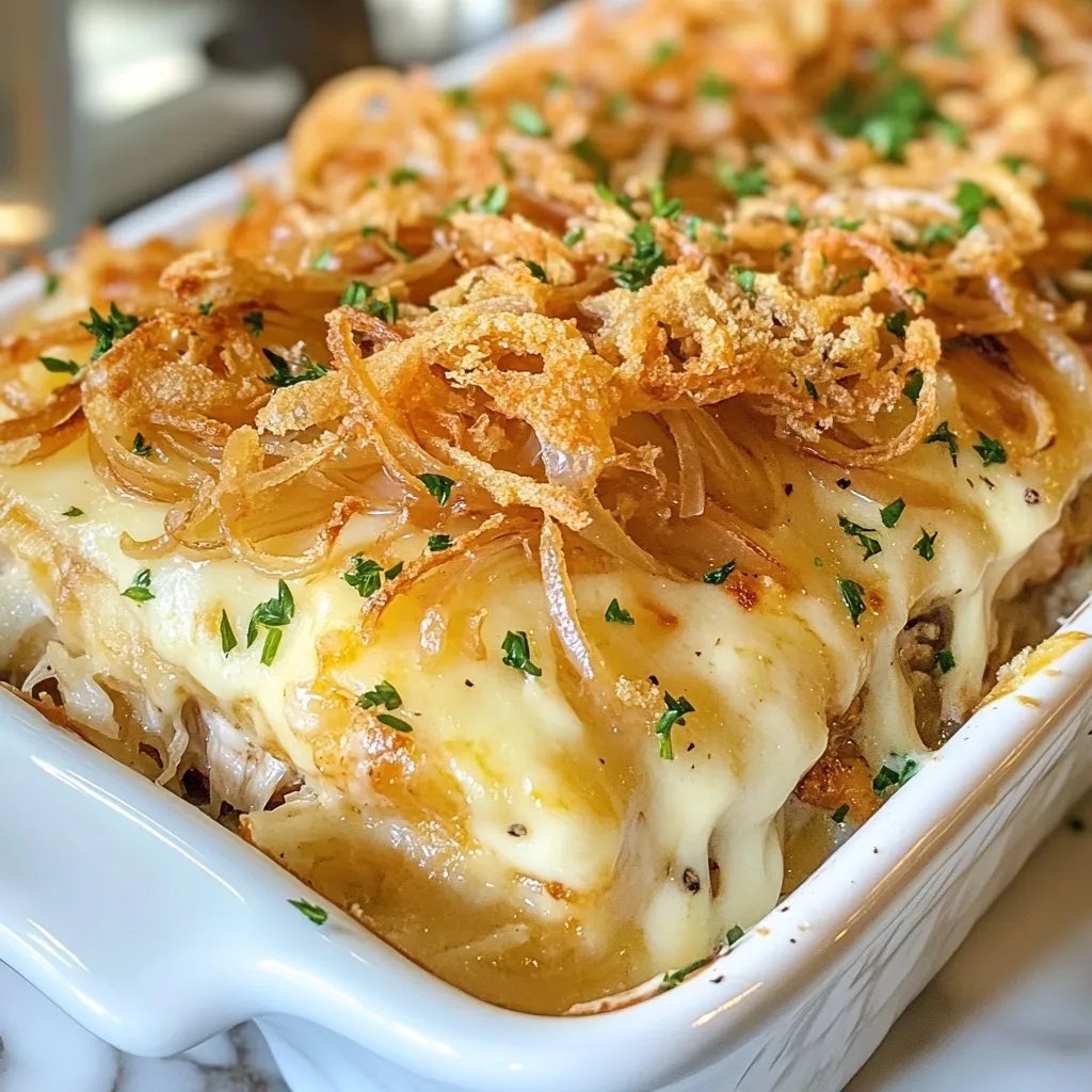 A comforting casserole featuring shredded chicken, caramelized onions, and Swiss cheese, topped with crispy French fried onions.