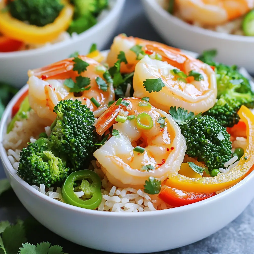 To make your rice bowls look great, arrange the shrimp neatly on top of the rice. Add the broccoli and bell peppers around the shrimp. Sprinkle green onions and cilantro on top for color. Serve with lemon wedges on the side for a fresh touch.