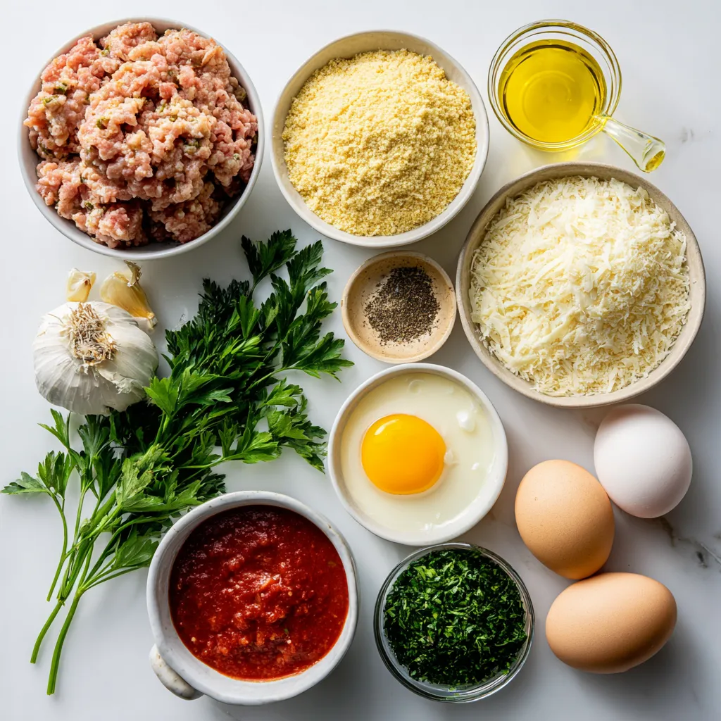 In a large mixing bowl, combine the ground chicken, breadcrumbs, grated Parmesan cheese, chopped parsley, minced garlic, and chopped onion.