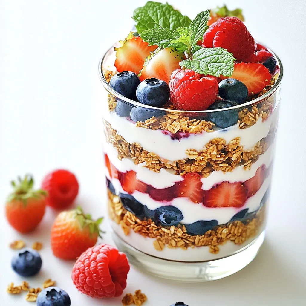 Grab a glass or parfait dish to layer your treat. Start with a big spoonful of the yogurt mixture at the bottom. Next, add a layer of mixed berries on top. Then, sprinkle a layer of granola, about 1/3 cup. Repeat this process. Keep adding layers until the glass is full. Finish with berries and a sprinkle of granola on top. For a pop of color, add fresh mint leaves as a garnish. This makes your parfait look even tastier!