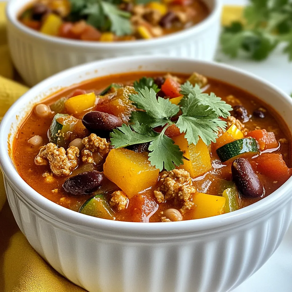 A hearty and flavorful chili made with ground turkey and a variety of vegetables, perfect for fall.