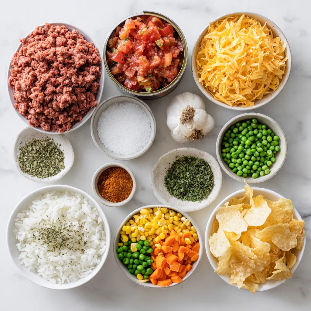 Hobo Ground Beef Casserole shines with its main ingredients. Ground beef gives this dish a hearty base. Chopped onion and minced garlic add depth. Frozen mixed vegetables bring color and nutrition. Diced tomatoes add moisture and flavor. Cooked rice helps bind the mix, giving it body. Italian seasoning and smoked paprika bring warmth and zest. Don’t forget to add salt and pepper to enhance all the flavors.
