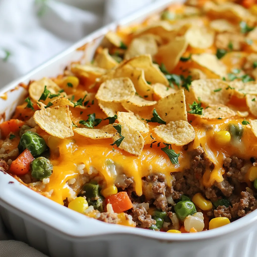 A hearty and comforting casserole made with ground beef, vegetables, and topped with cheese and crispy potato chips.