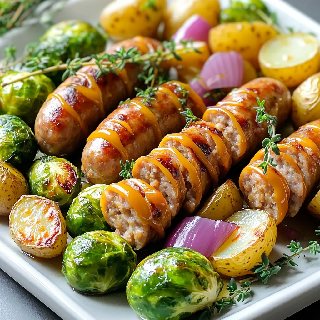 In a large bowl, mix the sliced sausages, Brussels sprouts, baby potatoes, and red onion. Make sure they are well combined.
