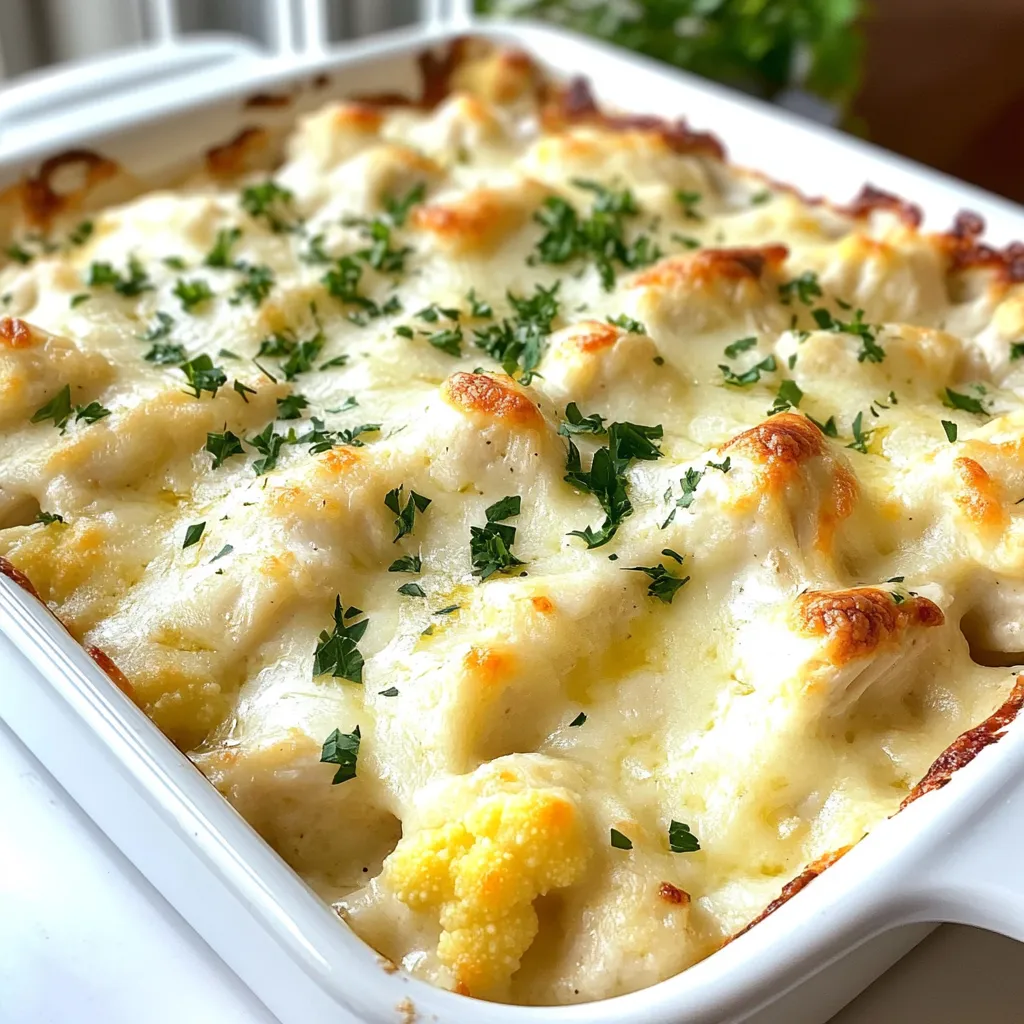 - 3 cups cooked chicken, shredded (can use rotisserie chicken) - 2 cups cauliflower florets (fresh or frozen) - 1 cup heavy cream - 1 cup shredded mozzarella cheese - 1/2 cup grated Parmesan cheese - 3 cloves garlic, minced - 1 teaspoon Italian seasoning - Salt and pepper to taste - 1/4 cup chopped fresh parsley (for garnish) These ingredients create a tasty and filling dish. You can easily find them at your local store. Using rotisserie chicken saves time and adds great flavor. This Keto Chicken Alfredo Casserole is packed with protein and healthy fats. Each serving has about: - Calories: 400 - Protein: 30g - Fat: 30g - Carbohydrates: 6g - Fiber: 2g This meal fits well in a low-carb diet. It's a great option for lunch or dinner. You can swap some ingredients if needed. Here are a few ideas: - Use turkey instead of chicken for a lighter dish. - Swap heavy cream with coconut cream for a dairy-free option. - Try different cheeses, like cheddar or gouda, for new flavors. - Add spinach or broccoli for more veggies. These alternatives still keep the dish flavorful and keto-friendly. Feel free to get creative with what you have on hand! {{ingredient_image_1}} First, set your oven to 350°F (175°C). This ensures your casserole cooks evenly. If you use fresh cauliflower, steam the florets for 5-7 minutes. They should be slightly tender. If you have frozen cauliflower, microwave it as per the package. Make sure to drain any extra water after cooking. In a large mixing bowl, combine the following ingredients: - 3 cups cooked chicken, shredded - 2 cups cauliflower florets - 1 cup heavy cream - 1 cup shredded mozzarella cheese - 1/2 cup grated Parmesan cheese - 3 cloves garlic, minced - 1 teaspoon Italian seasoning - Salt and pepper to taste Mix these well until everything is evenly combined. This step is key to a tasty casserole. Next, transfer the mixture to a greased 9x13 inch baking dish. Spread it out evenly so it cooks well. Cover the dish with aluminum foil. Bake it in the oven for 25 minutes. After that, remove the foil and bake for another 10-15 minutes. The top should be bubbly and golden. Once it’s done, let it cool for a few minutes. Finally, garnish with chopped fresh parsley for a pop of color. To cook chicken perfectly, use rotisserie chicken for ease. It saves time and adds flavor. If you prefer raw chicken, bake or boil it until it reaches 165°F. Shred the chicken into bite-sized pieces for the best texture in your casserole. Keep it moist by not overcooking. A juicy chicken makes your casserole stand out. Seasonings can transform your dish. I love using Italian seasoning for a warm, herby taste. Add salt and pepper to enhance the flavors. Fresh garlic is a must; it brings depth to the sauce. You can also mix in some red pepper flakes if you like heat. Toss the seasonings with the chicken and cheese for a tasty blend. For a creamier casserole, use high-fat heavy cream. It creates a rich sauce that coats each bite. Mixing in mozzarella and Parmesan adds gooey texture. If you want it even creamier, try adding cream cheese or sour cream. Make sure all ingredients are well-blended before baking. This ensures every spoonful is rich and delicious. Pro Tips Use Rotisserie Chicken: For a quick and easy shortcut, use store-bought rotisserie chicken to save time on prep while still enjoying a delicious meal. Perfect Cauliflower: If using fresh cauliflower, ensure it’s steamed just until tender to maintain a good texture in the casserole. Cheese Variations: Feel free to mix different cheeses like cheddar or gouda for a unique flavor twist in your casserole. Let it Rest: Allow the casserole to cool for a few minutes before serving. This helps it set and makes it easier to serve. {{image_2}} You can add more low-carb veggies to the casserole. Some great choices include: - Broccoli florets - Spinach - Zucchini - Bell peppers These veggies boost nutrition and flavor. Simply chop and mix them in with the other ingredients. They add color and crunch, making your dish even more appealing. Cheese adds richness to your casserole. You can switch up the cheese types for new flavors. Here are some options: - Cheddar cheese for a sharper taste - Cream cheese for extra creaminess - Gouda cheese for a smoky flavor Feel free to mix different cheeses. This makes the dish unique and personal to your taste. If you like heat, spice it up! Add crushed red pepper flakes or diced jalapeños. This gives your casserole a kick. You can also use spicy Italian sausage instead of chicken for added flavor. Adjust the spice level to fit your preference. Enjoy the bold taste that comes from this twist! To store your Keto Chicken Alfredo Casserole, let it cool first. Then, place it in an airtight container. You can keep it in the fridge for up to four days. If you want to enjoy it longer, consider freezing it. When you're ready to eat the leftovers, preheat your oven to 350°F (175°C). Place the casserole in an oven-safe dish. Cover it with foil to prevent drying out. Heat for about 20 minutes or until it's warm all the way through. You can also reheat individual portions in the microwave for about two to three minutes. To freeze the casserole, first let it cool completely. Cut it into serving sizes and wrap each portion tightly in plastic wrap. Then, place them in a freezer-safe bag or container. It can last for up to three months in the freezer. When you're ready to eat it, thaw it overnight in the fridge before reheating. This way, you can enjoy a tasty meal anytime! Yes, you can prepare this casserole ahead of time. Just follow the recipe until you mix all the ingredients. Then, cover the dish and place it in the fridge. You can bake it the next day. This keeps the flavors fresh and makes dinner easy. If you need a substitute for heavy cream, try using coconut cream or full-fat Greek yogurt. Both options are creamy and add nice flavor. You can also use a mix of milk and butter if you want a lighter choice. Yes, thi