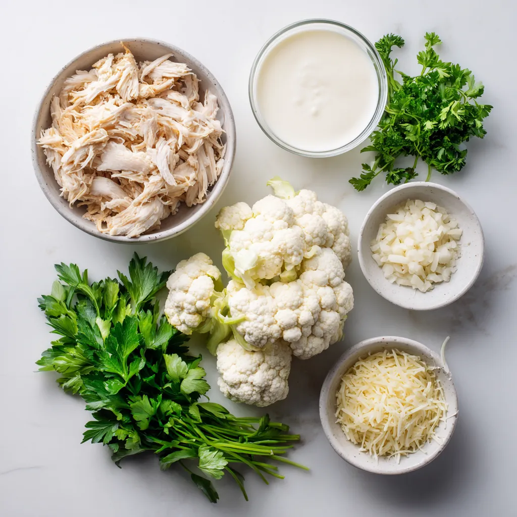 • In a large mixing bowl, combine the shredded chicken, steamed cauliflower, heavy cream, mozzarella cheese, Parmesan cheese, minced garlic, Italian seasoning, salt, and pepper. Mix well until all ingredients are evenly distributed.