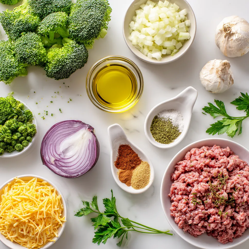The main ingredients are simple yet flavorful. Ground beef is the star of this dish. I prefer 80/20 beef for a good fat content. This mix keeps the meat juicy and tasty. Broccoli florets add a nice crunch and bright color. They are low in carbs, making them perfect for keto. Onion and garlic give depth to the dish. Dicing the onion and mincing the garlic enhances their flavors.