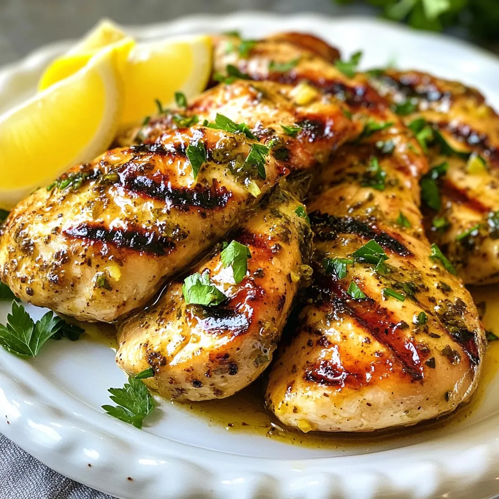 Time to fire up the grill! Preheat your grill or grill pan to medium-high heat. When the grill is ready, take the chicken out of the marinade. Let any excess marinade drip off, but don’t wipe it clean. Place the chicken on the grill. Cook for about 6-7 minutes on each side. You want the internal temperature to reach 165°F (75°C). This ensures the chicken is safe to eat. When done, move the chicken to a plate. Let it rest for about 5 minutes. This resting time helps the juices stay inside the meat. Finally, garnish with chopped fresh parsley for a pop of color. Enjoy your zesty lemon pepper chicken!