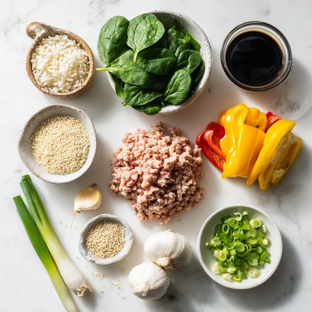 The ingredients in this Low Calorie Turkey Rice Bowl are simple but packed with flavor. You start with ground turkey, which is lean and full of protein. Brown rice serves as a hearty base. It is a smart choice because it has more fiber than white rice.