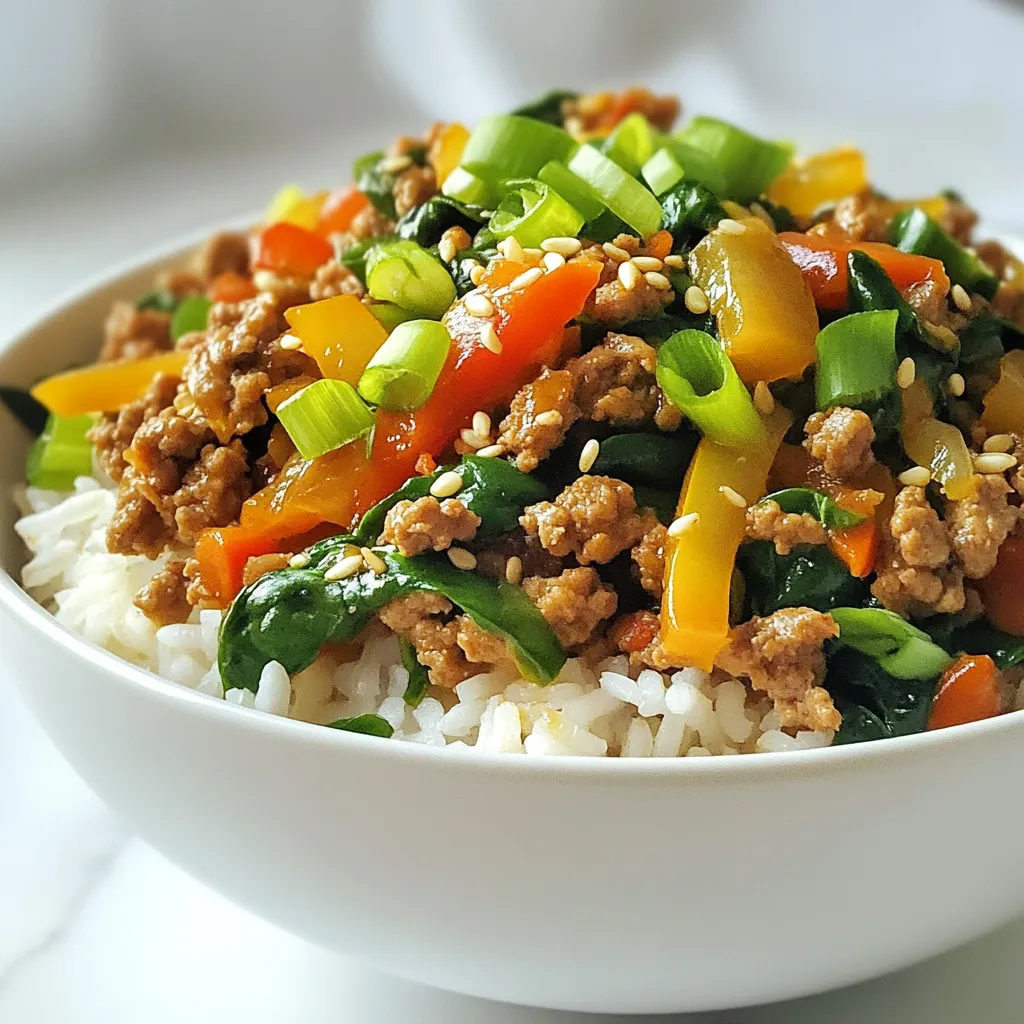 - Ground turkey - Brown rice - Fresh baby spinach - Onion - Garlic - Bell pepper - Low-sodium soy sauce - Sesame oil - Grated ginger - Salt and pepper - Green onion (for garnish) - Sesame seeds (optional) The ingredients in this Low Calorie Turkey Rice Bowl are simple but packed with flavor. You start with ground turkey, which is lean and full of protein. Brown rice serves as a hearty base. It is a smart choice because it has more fiber than white rice. Adding fresh baby spinach boosts the nutrition. Spinach is low in calories and high in vitamins. The onion and garlic give a nice aroma and taste. Bell peppers add a sweet crunch and color to the dish. For flavor, low-sodium soy sauce provides a savory touch without too much salt. Sesame oil adds depth and a hint of nuttiness. Grated ginger gives a warm spice that brightens the entire bowl. Finally, salt and pepper enhance all these wonderful flavors. You can garnish with green onion for a fresh bite and sesame seeds for a bit of crunch. This combination of ingredients creates a balanced meal that is both tasty and healthy. {{ingredient_image_1}} To cook the brown rice, follow the package instructions. Usually, you will need about 30-35 minutes. Here’s how to get it just right: - Use a 1:2 ratio of rice to water. - Bring the water to a boil, then add the rice. - Cover the pot and lower the heat to simmer. - Check it after 30 minutes. If it is tender and absorbs all the water, it's ready. Perfect rice should be fluffy, not sticky. For best results, let it sit covered for a few minutes after cooking. Start by heating 1 tablespoon of sesame oil in a large skillet over medium heat. Once the oil is hot, add: - 1 small chopped onion Sauté the onion for about 3-4 minutes until it turns translucent. Next, add: - 2 cloves of minced garlic - 1 teaspoon of grated ginger Stir these for an additional 1-2 minutes. You want to release their wonderful aromas without burning them. Now, raise the heat to medium-high. Add: - 1 pound of ground turkey Cook it until browned, about 6-8 minutes. Make sure to break it apart with a spatula as it cooks. When the turkey is no longer pink, add: - 1 diced bell pepper Stir and cook for another 2-3 minutes until the pepper softens. Finally, add: - 2 cups of fresh baby spinach This will wilt quickly. Drizzle in: - 2 tablespoons of low-sodium soy sauce Mix everything well and season with salt and pepper to your taste. Once the brown rice is ready, fluff it with a fork. Divide the rice into serving bowls. Top each bowl with the turkey and vegetable mixture. For a nice finish, garnish with: - Sliced green onions - Sesame seeds (if you like) This adds a lovely crunch and flavor! Enjoy your meal, packed with healthy ingredients and delicious taste. To boost flavor in your turkey rice bowl, try adding herbs and spices. Fresh herbs like cilantro or basil can brighten the dish. Dried herbs, such as oregano or thyme, work well too. They add depth without extra calories. You can also explore alternative sauces. Instead of low-sodium soy sauce, try teriyaki or a splash of lime juice. These options enhance the taste and add a unique twist. A drizzle of sriracha brings heat, while a touch of honey can add sweetness. Batch cooking is an easy way to enjoy this dish all week. Make double the amount of turkey and rice. Store the extra in separate containers. This way, you can mix and match for quick meals. For storage, let your turkey rice bowl cool before sealing. Use airtight containers to keep it fresh. This helps prevent sogginess. When ready to eat, simply reheat in the microwave or on the stove. Each ingredient in your turkey rice bowl brings health benefits. Ground turkey is lean protein, helping build muscle. Brown rice offers fiber, which supports digestion. Spinach is rich in vitamins A and C, boosting your immune system. To lower calorie content further, use less sesame oil. You can also reduce soy sauce for less sodium. Swap brown rice for cauliflower rice for a low-carb option. This keeps the meal light while still being filling. Pro Tips Use Fresh Ingredients: Fresh baby spinach and vibrant bell peppers not only enhance the flavor but also add essential nutrients to your meal. Customize the Protein: Feel free to substitute the ground turkey with ground chicken, beef, or even a plant-based protein for a different flavor profile. Perfect Rice Cooking: Rinse the brown rice under cold water before cooking to remove excess starch, which helps achieve a fluffier texture. Enhance with Spices: Experiment with adding spices like chili flakes or a dash of five-spice powder for an extra kick of flavor in your rice bowl. {{image_2}} You can swap ground turkey for plant-based protein. Options like lentils or chickpeas work well. These proteins give your dish a hearty feel without meat. They also add fiber, making your meal filling and healthy. Plus, using plant-based protein can lower calorie content. If you want a low-carb option, replace the rice with cauliflower rice. Cauliflower rice is light and easy to make. Simply pulse cauliflower florets in a food processor until they resemble rice. Sauté it in the same skillet for a quick, tasty base. This swap cuts carbs and calories while keeping flavor. Explore different vegetables and seasonings for diverse flavors. Try adding mushrooms, zucchini, or carrots for more texture. Fresh herbs like basil or cilantro can brighten the dish. You can also change up the sauce; teriyaki or hoisin will add a sweet twist. Each variation brings a new taste to your turkey rice bowl. To store your turkey rice bowl, use airtight containers. Glass or plastic containers work well. Make sure the dish cools down before sealing. Let it sit at room temperature for about 30 minutes. This helps avoid steam build-up, which can make your meal soggy. Reheat your turkey rice bowl on the stove for best results. Heat a skillet over medium heat. Add a splash of water or broth to keep it moist. Stir occasionally until 