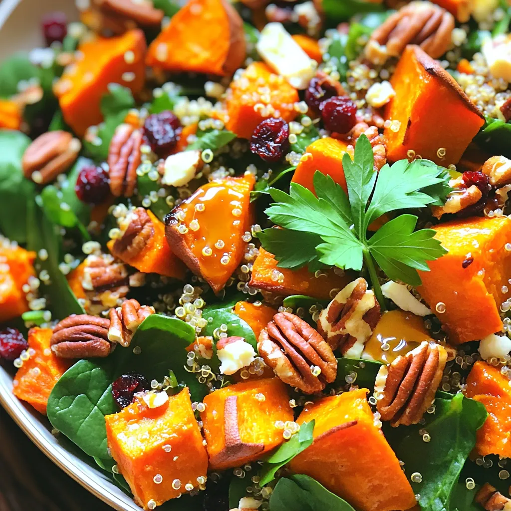 In a large bowl, mix the roasted sweet potatoes, cooked quinoa, 1 cup of chopped spinach, 1/2 cup of dried cranberries, and 1/2 cup of roughly chopped pecans. Stir gently to combine.
