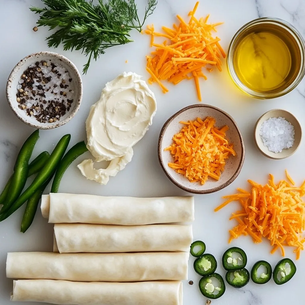 The main ingredients for mini jalapeño popper egg rolls are simple yet flavorful. Cream cheese gives a rich base that mixes well with spicy jalapeños. You can use fresh jalapeños for a fresh taste or pickled for a tangy twist. Garlic and onion powder add depth, while salt and pepper enhance all the flavors. The egg roll wrappers are the perfect vehicle for these tasty fillings, creating a crunchy shell when fried.