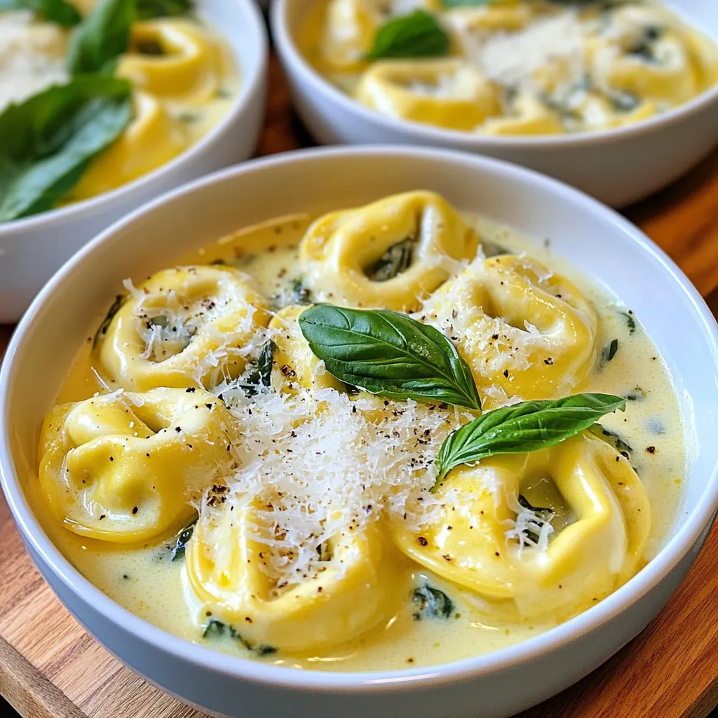 For a great visual, serve your creamy tortellini in shallow bowls. Drizzle some broth sauce over each serving. This adds color and makes it look inviting.