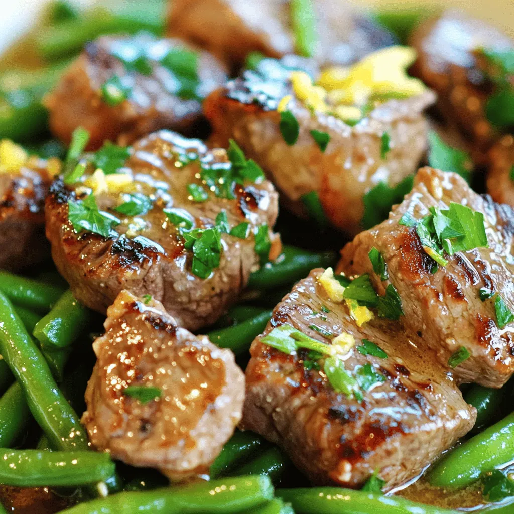 Finally, remove the skillet from heat. Garnish the dish with chopped parsley for a pop of color. Serve the steak bites and green beans hot. You can plate them together for a beautiful presentation. Enjoy your meal!