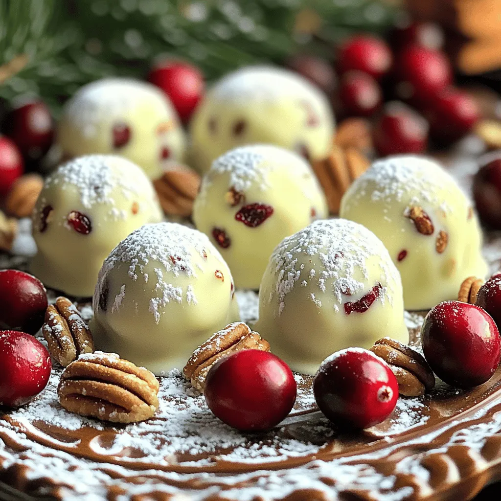 To make No-Bake Cranberry White Chocolate Truffles, you need a few simple ingredients. Each one plays an important role in making these truffles tasty and fun. Here's what you'll need: - 8 oz white chocolate, chopped - 1/2 cup sweetened condensed milk - 1 cup dried cranberries, roughly chopped - 1 cup graham cracker crumbs - 1/2 teaspoon vanilla extract - 1/4 cup finely chopped pecans (for rolling) - Pinch of salt These ingredients create a sweet and creamy treat. The white chocolate gives a smooth base. The cranberries add a tart kick, and the graham cracker crumbs give texture. The vanilla extract enhances the flavor, while the pecans add a nice crunch when you roll the truffles. Using high-quality white chocolate makes a big difference. It melts better and tastes richer. Sweetened condensed milk helps bind everything together and adds sweetness. Dried cranberries can be swapped for other fruits, but they pair well with the white chocolate. Gather these ingredients, and you’re ready to make a delightful treat. Enjoy the process and the flavors! First, grab a heatproof bowl. Combine 8 ounces of chopped white chocolate and 1/2 cup of sweetened condensed milk. This mixture needs gentle heat. Set your bowl over a pot of simmering water. This is the double boiler method. Stir until it melts and looks smooth. Remove the bowl from the heat. Now, it’s time to add some fun flavors. Stir in 1 cup of roughly chopped dried cranberries. Next, add 1 cup of graham cracker crumbs. Don’t forget the 1/2 teaspoon of vanilla extract and a pinch of salt. Mix all the ingredients well. Make sure everything blends nicely. Let the mixture cool for a bit. Then, place it in the fridge for about 30 minutes. This helps it firm up. Once it’s cool enough to handle, scoop out small portions. Roll each portion into a ball, about 1 inch wide. Now, roll each truffle in 1/4 cup of finely chopped pecans. This adds a nice crunch. Place the coated truffles on a lined baking sheet. Refrigerate them for another 20 minutes to set. Enjoy the sweet and tangy flavors! Cooling time is key to a great truffle. After mixing, let the mixture chill for 30 minutes. This helps it firm up. If your mixture seems too soft, you can add more graham cracker crumbs. Start with a tablespoon at a time. Mix well and check the texture again. You want it firm enough to roll. To present your truffles beautifully, use a decorative box or a nice platter. You can arrange them with fresh cranberries around them. A sprinkle of powdered sugar adds a nice touch. You can also pair them with flavors like orange zest or cinnamon. These flavors enhance the tartness of cranberries. You will need a few simple tools. A heatproof bowl helps melt the chocolate easily. A double boiler setup is key for gentle heating. You also need a baking sheet lined with parchment paper. This keeps your truffles from sticking. Use a small cookie scoop for even truffles. {{image_2}} To make your truffles unique, try different nuts and fruits. You can swap pecans for walnuts or almonds. You can also add other dried fruits like cherries or apricots. Each nut or fruit gives a new taste. You can also change the chocolate. Instead of white chocolate, try dark or milk chocolate. Dark chocolate adds a rich flavor, while milk chocolate makes it sweeter. Experiment with what you like best! If you need gluten-free options, use gluten-free graham crackers. They work just as well and keep the truffles tasty. For a vegan version, replace white chocolate with a dairy-free option. Use coconut cream instead of sweetened condensed milk. These swaps make the truffles fit different diets without losing flavor. I recommend storing your No-Bake Cranberry White Chocolate Truffles in the fridge. This keeps them fresh and tasty. If you want longer storage, the freezer is a good option. Just place the truffles in an airtight container. This way, they won’t stick together. Remember to let them thaw in the fridge before eating. These truffles last up to two weeks in the fridge. In the freezer, they can last for about three months. Always look for signs of spoilage. If the truffles smell off or change color, it’s best to throw them away. Enjoy your truffles while they are fresh for the best taste! Yes, you can use dark or milk chocolate instead of white chocolate. Each type gives a unique taste. Dark chocolate adds richness, while milk chocolate offers sweetness. Keep the same amount, about 8 oz. Try different chocolate types to find your favorite! To make your truffles festive, add colorful sprinkles or edible glitter. You could also drizzle melted chocolate on top. Use holiday-themed liners for serving. Consider shaping them into different forms, like stars or hearts. These touches add fun to your treats! Yes, you can make these truffles ahead of time. Store them in the fridge for up to a week. For longer storage, freeze them. Just make sure to place them in airtight containers. Thaw them in the fridge before serving for the best texture. These white chocolate truffles are easy to make and full of flavor. First, you melt the chocolate and mix in tasty ingredients like cranberries and pecans. After chilling, roll them into perfect bites. Remember the tips for texture and serving to impress. You can even try fun variations to fit your taste. Store them right to enjoy longer. Dive into this sweet treat and let your creativity shine. Enjoy making these delights for any occasion!