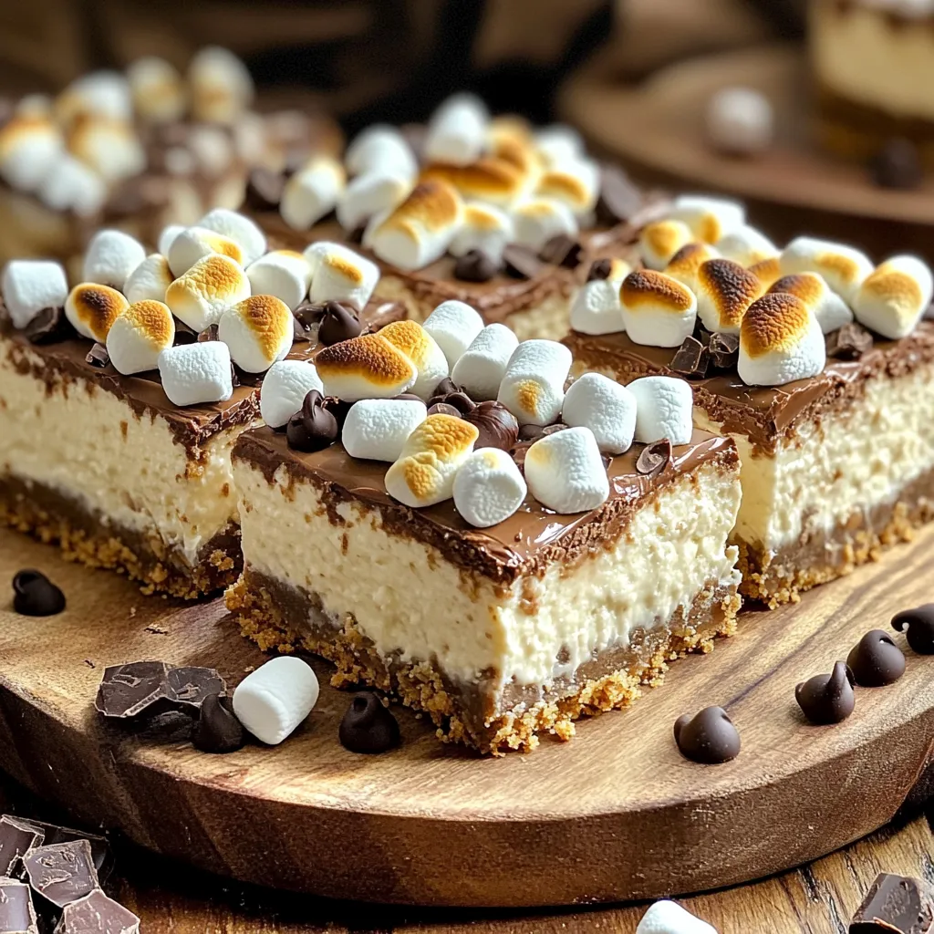 To make No-Bake S’mores Cheesecake Bars, gather these ingredients: - 1 1/2 cups graham cracker crumbs - 1/4 cup granulated sugar - 1/2 cup unsalted butter, melted - 2 cups cream cheese, softened - 3/4 cup powdered sugar - 1 teaspoon vanilla extract - 1 cup heavy whipping cream - 1 cup mini marshmallows - 1/2 cup milk chocolate chips - 1/2 cup dark chocolate chips - Extra mini marshmallows and chocolate shavings for topping These ingredients create a rich, creamy, and sweet treat. The graham cracker crumbs form a crunchy base. The cream cheese and whipped cream give the bars a smooth texture. Adding mini marshmallows and chocolate chips brings the classic s'mores flavor to life. With this list of ingredients, you can easily make this fun dessert. You can also personalize it by adding your favorite toppings or flavors. For example, consider using different types of chocolate or adding a sprinkle of sea salt. Each ingredient plays a key role in making the bars delicious and satisfying. To start, gather your ingredients. In a medium bowl, combine: - 1 1/2 cups graham cracker crumbs - 1/4 cup granulated sugar - 1/2 cup unsalted butter, melted Mix these together until all crumbs are coated. Then, press the mixture firmly into a lined 9x9 inch baking pan. This forms the crust. Place the pan in the fridge to set while you prepare the filling. Next, let's make the cheesecake filling. In a large mixing bowl, beat: - 2 cups cream cheese, softened - 3/4 cup powdered sugar - 1 teaspoon vanilla extract Mix until it is smooth and creamy. In another bowl, whip 1 cup of heavy cream until stiff peaks form. This adds air and makes the cheesecake light. Now, gently fold the whipped cream into the cream cheese mixture. Be careful not to deflate the whipped cream. Once combined, fold in: - 1 cup mini marshmallows - 1/2 cup milk chocolate chips - 1/2 cup dark chocolate chips Spread the cheesecake mixture over the chilled crust. Use a spatula to smooth the top. For fun, press in extra mini marshmallows and chocolate chips for decoration. Cover the pan with plastic wrap and chill for at least 4 hours. This helps the cheesecake set well. To make the best no-bake s'mores cheesecake bars, mix your cream cheese well. Start with softened cream cheese. This ensures a smooth filling. If you rush this step, lumps might form. Use an electric mixer for even better results. When you whip the heavy cream, watch for stiff peaks. This gives your cheesecake a light, fluffy texture. After whipping, fold it gently into the cream cheese mixture. Be careful not to deflate the whipped cream. If you mix too hard, the air will escape. This can make your cheesecake dense instead of airy. How you serve these bars can make a big impact. Use a wooden platter or a fancy dessert dish. This can add a touch of class. You can even toast mini marshmallows with a kitchen torch. This adds a nice look and flavor. Placing toasted marshmallows on top makes the bars more appealing. For extra flair, sprinkle some chocolate shavings on top. This enhances the visual appeal. It also hints at the rich chocolate flavor inside. With these tips, your s'mores cheesecake bars will not only taste great but look amazing too! {{image_2}} You can get creative with your no-bake s'mores cheesecake bars. One fun option is to add peanut butter. Just mix in half a cup of creamy peanut butter to the cheesecake filling. This will give your bars a nutty twist that is hard to resist. You can also add fruit or nuts for extra flavor. Try folding in some chopped strawberries or bananas. This adds freshness and sweetness. You can also use crushed nuts, like pecans or walnuts, for a crunchy bite. If you need a gluten-free option, swap regular graham crackers for gluten-free ones. This simple change keeps the crust tasty and safe for those with gluten issues. For a dairy-free version, use cream cheese made from nuts or tofu. You can find many dairy-free cream cheese brands at stores. This way, everyone can enjoy these delicious bars! To keep your no-bake s'mores cheesecake bars fresh, cover them well. Use plastic wrap or foil to seal the dish. This keeps out air and moisture. Store the bars in the fridge. They will stay tasty and cool. If you want to keep them longer, freezing is a great option. Cut the bars into pieces first. Wrap each piece in plastic wrap. Then place them in a freezer-safe bag. This way, they are easy to grab later. These cheesecake bars last about a week in the fridge. Check the bars after a few days. They might start to lose their creamy texture. Trust your taste buds! If they taste off or look strange, it’s best to toss them. Signs of spoilage include: - An odd smell - A change in color - A slimy texture Storing them correctly will help you enjoy these tasty treats for days! Yes, you can use different types of chocolate. Semi-sweet chocolate chips work great. You can also try extra dark chocolate for a richer taste. Both options give a nice twist to the bars. Mix and match to find your favorite flavor! These bars need to chill for at least four hours. This time helps the cheesecake set properly. For the best results, I recommend chilling them overnight. This way, they become firm and easier to cut. Plus, the flavors meld together nicely! Yes, you can make these bars ahead of time. Prepare them a day or two before serving. Just cover them well and keep them in the fridge. This makes them a perfect treat for parties or family gatherings. You will save time and impress your guests! You’ve learned how to make delicious cheesecake bars with simple steps. We covered every ingredient, from the graham cracker crust to the creamy filling. I shared tips for a perfect texture and fun variations you can try. Don’t forget the storage tips to keep your treats fresh. These bars are perfect for any occasion and easy to enjoy. Get creative, have fun, and savor every bite!