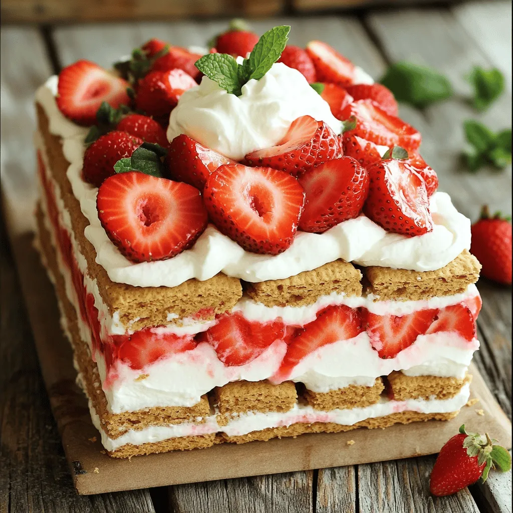 When layering, start with a solid base of graham crackers. Make sure they cover the entire bottom of your dish. Spread whipped cream evenly on top of the crackers. Don’t rush this step; a smooth layer looks best. Add strawberries in a thin, even layer. Repeat this process. You can make as many layers as you like. Just remember that the top should end with whipped cream. This makes for a pretty finish.