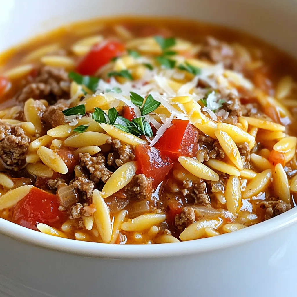 A hearty and flavorful one-pot dish featuring ground beef and orzo pasta cooked in a savory broth.