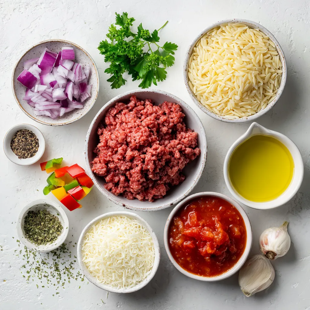 To make One-Pot Beef Orzo, you need a few key ingredients. First, ground beef gives it a rich flavor. The orzo pasta adds a nice texture. A finely chopped onion brings sweetness and depth.