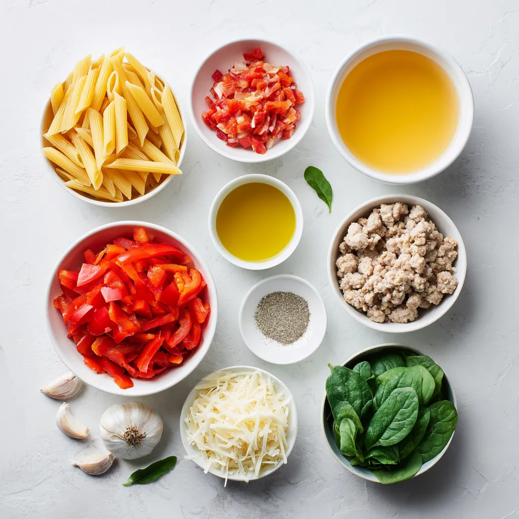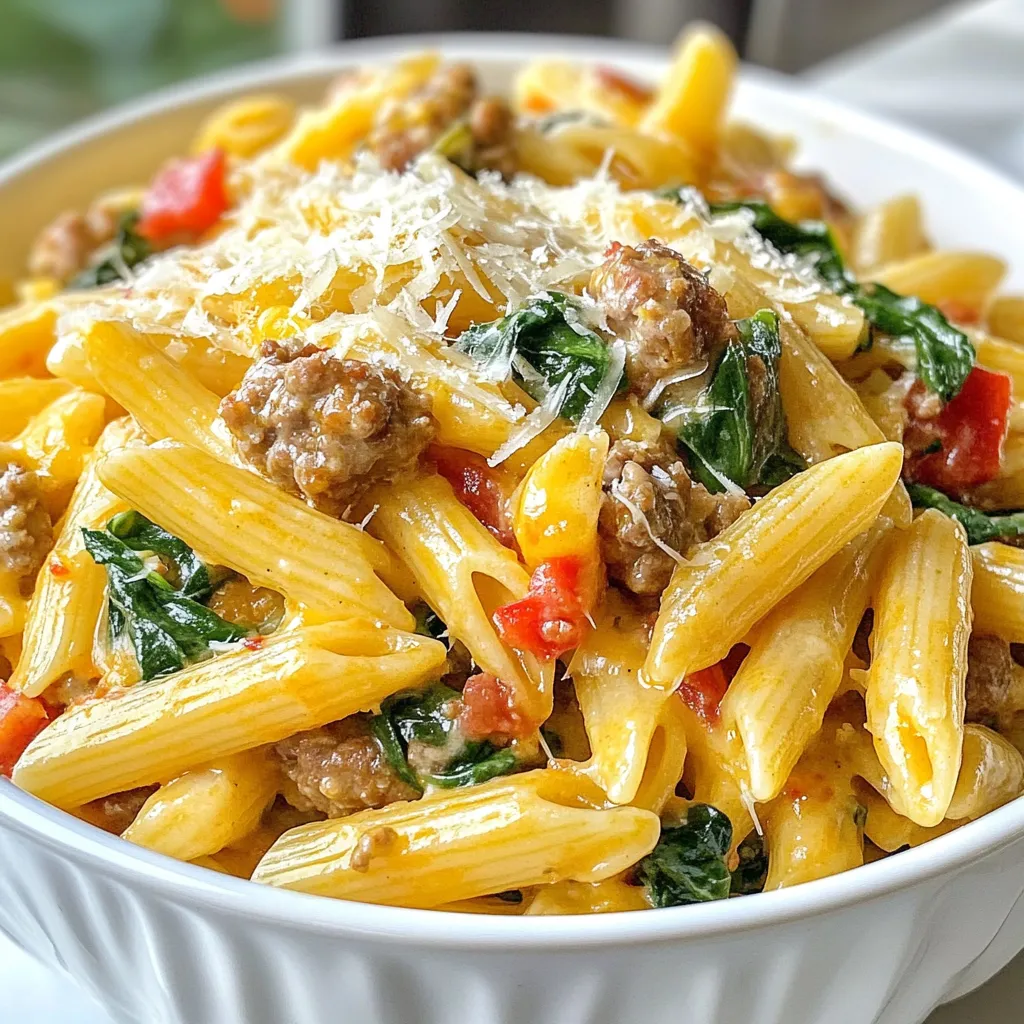 - 12 oz (340g) penne pasta - 1 lb (450g) Italian chicken sausage, casings removed - 1 small onion, diced - 2 cloves garlic, minced - 1 red bell pepper, diced - 1 can (14.5 oz) diced tomatoes, with juices - 4 cups low-sodium chicken broth - 1 teaspoon Italian seasoning - 2 cups fresh baby spinach - 1 cup shredded mozzarella cheese - ¼ cup grated Parmesan cheese - Salt and pepper to taste - 1 tablespoon olive oil Measuring ingredients exactly helps your dish turn out great. Use a kitchen scale for precision. If you don't have penne, any short pasta works well. Swap chicken sausage for turkey sausage for a leaner option. Fresh spinach can be replaced with frozen, just thaw it first. If you want a bolder taste, use more garlic or add red pepper flakes for heat. Fresh ingredients make a big difference in flavor. Fresh spinach adds color and nutrients. Diced tomatoes bring richness and acidity. Using fresh garlic and onion boosts the dish’s aroma. Choose high-quality cheese for the best melt and creaminess. When you use fresh foods, your One Pot Cheesy Sausage Pasta will taste better and be more satisfying. {{ingredient_image_1}} First, gather all your ingredients. You will need: - 12 oz (340g) penne pasta - 1 lb (450g) Italian chicken sausage, casings removed - 1 small onion, diced - 2 cloves garlic, minced - 1 red bell pepper, diced - 1 can (14.5 oz) diced tomatoes, with juices - 4 cups low-sodium chicken broth - 1 teaspoon Italian seasoning - 2 cups fresh baby spinach - 1 cup shredded mozzarella cheese - ¼ cup grated Parmesan cheese - Salt and pepper to taste - 1 tablespoon olive oil Chop the onion, garlic, and red bell pepper. This helps the cooking go smoothly. Heat the olive oil in a large pot over medium heat. Add the onion and cook until it turns clear, around 3–4 minutes. Next, add the garlic and red bell pepper. Cook them for another 2 minutes. The smell will be great! Now, push the veggies to one side of the pot. Add the sausage. Break it up with a spatula. Cook until it turns brown, about 5–7 minutes. After that, stir in the penne pasta, diced tomatoes (with juices), chicken broth, Italian seasoning, salt, and pepper. Bring this mixture to a boil. Once it boils, lower the heat, cover the pot, and let it simmer for 12–15 minutes. Stir occasionally. This helps the pasta cook well and not stick. When the pasta is tender, take the pot off the heat. Gently mix in the fresh spinach and mozzarella cheese. Let it sit for a few minutes. This allows the cheese to melt and the spinach to wilt. Finally, sprinkle the grated Parmesan cheese on top before serving. - Prep Time: 10 minutes - Cooking Time: 20 minutes - Total Time: 30 minutes - Servings: 4 Keep the heat medium when you start, then lower it for simmering. This makes the pasta cook just right! To boost the taste of your One Pot Cheesy Sausage Pasta, try these tips: - Use fresh herbs: Fresh basil or parsley adds a nice touch. - Add red pepper flakes: If you like heat, sprinkle some in. - Sauté vegetables longer: Cooking the onion and pepper until caramelized brings out sweetness. - Use homemade broth: If possible, homemade chicken broth adds depth. - Finish with lemon juice: A splash of lemon brightens the dish and balances flavors. Here are some common pitfalls to watch out for: - Not stirring enough: Stirring prevents pasta from sticking to the pot. - Skipping the salt: Don't forget to season the broth. It makes a big difference. - Overcooking the pasta: Keep an eye on the cooking time, so it stays al dente. - Adding cheese too early: Wait until the end to mix in cheese for a creamy finish. Need to adjust the recipe? Here’s how: - For 2 servings: Use 6 oz of pasta and half the sausage. - For 6 servings: Increase to 18 oz of pasta and 1.5 lbs of sausage. - Scaling other ingredients: Keep the same ratios for broth, veggies, and cheese. - Cooking time: The time stays close, but always check for doneness. Pro Tips Tip for Perfect Pasta: Always cook the pasta until it is al dente. This ensures it retains some bite and doesn’t become mushy once combined with the sauce. Sausage Selection: Choose a high-quality Italian chicken sausage for the best flavor. You can also experiment with different types of sausage, like spicy or sweet, to suit your taste. Add Fresh Herbs: Consider adding fresh basil or parsley at the end for a burst of flavor and freshness, elevating the dish even further. Cheese Variations: Mix in different types of cheese, such as cheddar or gouda, for a unique twist on the classic cheesy flavor. {{image_2}} You can switch the Italian chicken sausage for other proteins. Ground turkey works well. It will keep the dish light and tasty. If you prefer beef, go for a lean ground beef. Cook it until it's browned, just like the sausage. For a spicier kick, try chorizo. It adds a rich flavor that makes the dish exciting. If you want a vegetarian version, skip the meat. Use more veggies instead. Mushrooms are great for a hearty texture. You can also add zucchini, eggplant, or any veggies you like. Replace the sausage with canned chickpeas for protein. They add a nice bite and blend well with the pasta. You can easily change the pasta type. Penne is a classic choice, but feel free to try others. Fusilli or rotini will hold the sauce well. You can even use gluten-free pasta if needed. Just check the cooking time, as it may vary. Each type gives a unique twist to the dish, so have fun with it! To keep your One Pot Cheesy Sausage Pasta fresh, let it cool first. Once cool, transfer it to an airtight container. Store it in the fridge for up to three days. If you want to keep it longer, freezing is a great option. To reheat, take your leftover pasta from the fridge. Place it in a pot over low heat. Add a splash of chicken broth or water to help it heat evenly. Stir occasionally until it’s warmed through. You can also use the microwave. Just cover it and heat in short bursts, stirring in between. If you want to freeze your past