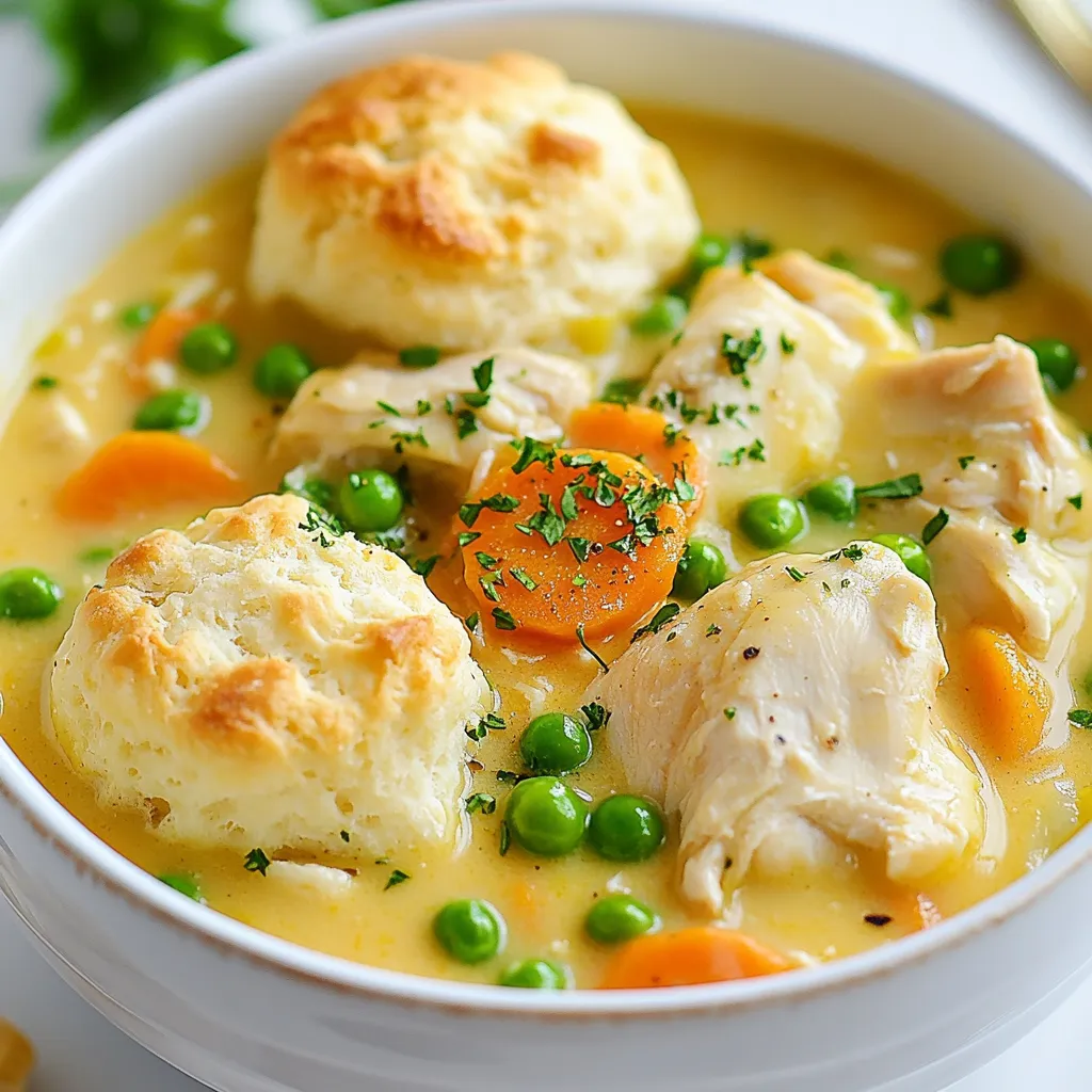 Stir in the heavy cream and bring the soup back to a gentle simmer. Adjust the seasoning with salt and pepper to taste. Next, drop the biscuit pieces into the soup. Let them cook for about 7-10 minutes until they are fluffy and cooked through. Once the biscuits are ready, remove the pot from heat. Ladle the soup into bowls and garnish with fresh parsley before serving. Enjoy this warm, comforting dish!