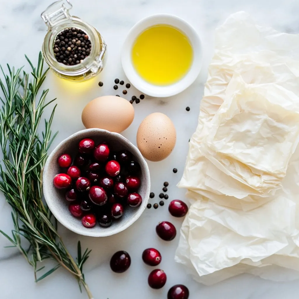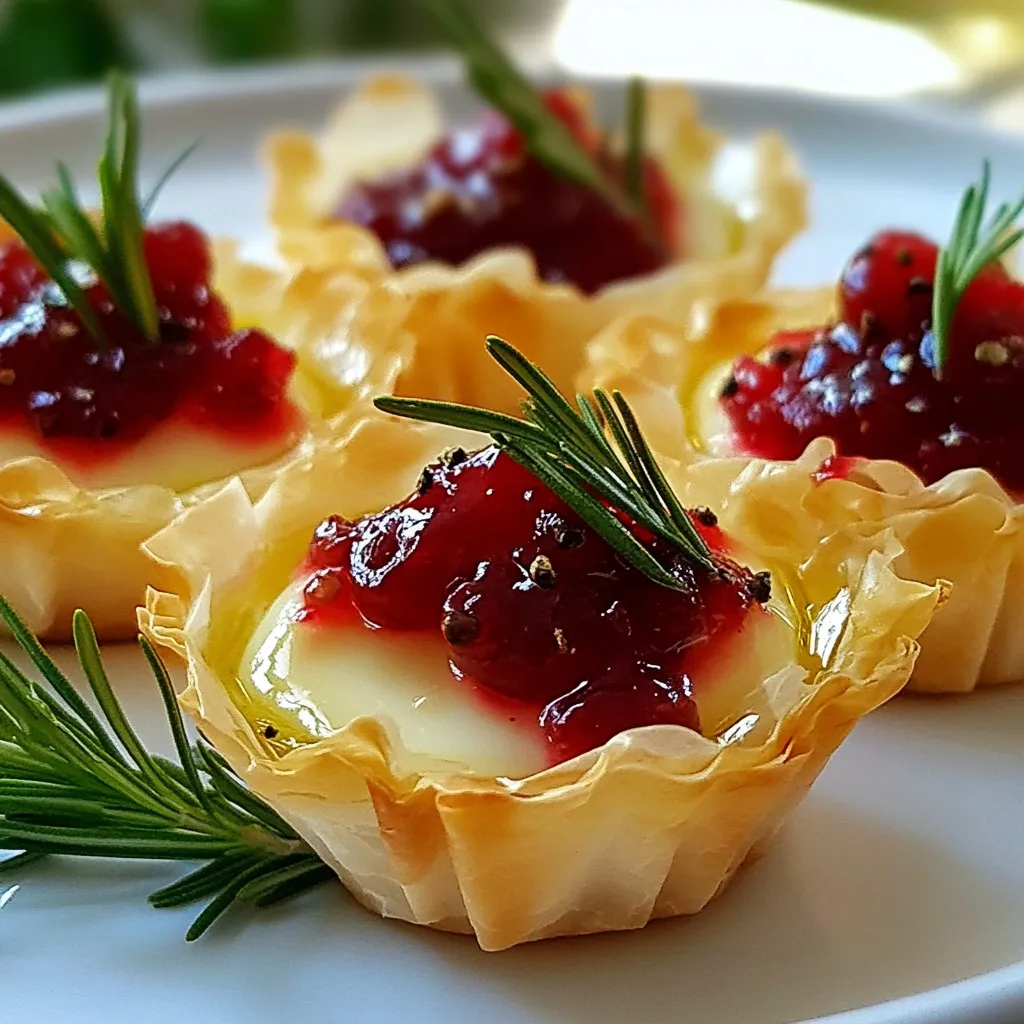 - 1 package of phyllo pastry (about 12 sheets) - 1 cup fresh cranberries - 8 oz Brie cheese, cut into small pieces - 1/2 cup sugar - 1/4 cup water - 1 tablespoon fresh rosemary, chopped - 1 tablespoon olive oil - 1/4 teaspoon black pepper - 1 egg (for wash) The main ingredients set the stage for these tartlets. Phyllo pastry brings a crispy texture. Fresh cranberries give a burst of tartness, which balances the rich Brie cheese. The additional ingredients sweeten the cranberries. Sugar and water help create a lovely sauce. Fresh rosemary adds an herby note that lifts the flavors. An egg wash is crucial, too. It gives your tartlets a beautiful golden color. Olive oil and black pepper add flavor and shine. Using these ingredients, you will create a dish that impresses everyone. Each bite will offer a mix of textures and tastes. The tartlets serve as a perfect festive appetizer. {{ingredient_image_1}} - First, combine 1 cup of fresh cranberries, 1/2 cup of sugar, and 1/4 cup of water in a saucepan. - Cook over medium heat. Stir occasionally until the cranberries burst. This takes about 10-15 minutes. - Once thickened, remove it from heat and let it cool. This sauce adds a sweet and tart flavor. - Next, lay out a sheet of phyllo pastry on a clean surface. Brush it lightly with 1 tablespoon of olive oil. - Repeat this with two more sheets, stacking them on top. This helps create a nice texture. - Cut the layered phyllo into squares, about 4x4 inches. These will form the tartlet cups. - Gently press each square into a muffin tin cup. This forms the shell for your tartlets. - Now, fill each phyllo cup with small pieces of Brie cheese. - Top each one with a spoonful of the cranberry sauce. Add a sprinkle of fresh rosemary and black pepper for extra flavor. - To finish, prepare the egg wash. Beat 1 egg with a splash of water in a small bowl. - Brush the edges of the phyllo cups with the egg wash. This gives them a golden finish. - Place the muffin tin in a preheated oven at 375°F (190°C). Bake for 15-20 minutes until the phyllo is golden and crispy. These steps will guide you to make delicious savory cranberry brie tartlets. Enjoy the fun of creating these festive bites! To make the perfect cranberry sauce, start by adjusting the sweetness. You can add more sugar if you like it sweeter. If you prefer a healthier option, try using honey or maple syrup instead of sugar. These alternatives give a unique flavor while keeping the sauce tasty. Handling phyllo pastry can be tricky. To avoid tearing, keep the sheets covered with a damp cloth while you work. This keeps them moist and easier to handle. If you have leftover phyllo, store it in an airtight container in the fridge. Use it within a few days to keep it fresh. For a beautiful presentation, garnish the tartlets with extra rosemary. A light drizzle of olive oil adds shine. Pair these tartlets with sparkling wine or a light beer. The flavors blend nicely and elevate your dish. Enjoy sharing them at your next gathering! Pro Tips Use Fresh Cranberries: Fresh cranberries provide the best flavor and texture for this recipe. Avoid canned cranberry sauce for a more vibrant tartlet. Layering Phyllo Pastry: Ensure you brush each layer of phyllo with olive oil to achieve a flaky and crispy texture. Don’t skip this step! Customize Fillings: Feel free to experiment with different cheeses or herbs, such as goat cheese or thyme, to create your unique flavor combination. Serving Suggestions: These tartlets are best served warm. Consider pairing them with a light salad or a glass of sparkling wine for an elegant appetizer. {{image_2}} You can switch out Brie for other cheeses. Try goat cheese for a tangy flavor. Cream cheese is smooth and mild, while blue cheese gives a bold taste. Each cheese adds its own unique flavor profile. Goat cheese offers a creamy, tart bite. Cream cheese provides a rich, soft texture. Blue cheese brings a sharp, funky taste that pairs well with cranberries. Get creative with fillings in your tartlets. Add chopped nuts like walnuts or pecans for crunch. Diced apples or pears can add sweetness and texture. You can also try spicy elements, like jalapeños or red pepper flakes, for a kick. Mixing in sautéed onions or garlic can create savory depth. These twists keep your tartlets exciting and flavorful. If you want a plant-based version, use vegan cheese. Brands like Violife or Daiya offer great options. For the egg wash, substitute with a mixture of plant-based milk and a little oil. This gives a shiny finish without using eggs. You can also skip the wash altogether for a rustic look. These changes make the tartlets suitable for everyone. To keep your leftover tartlets fresh, store them in an airtight container. Place a paper towel at the bottom to absorb any moisture. This helps keep the phyllo crispy. You can refrigerate them for up to three days. After that, the texture may change, and they could become soggy. You can freeze these tartlets both before and after baking. If you freeze them before baking, assemble the tartlets and place them on a baking sheet. Freeze until solid, then transfer them to a zip-top bag. They will last for up to three months. To bake from frozen, just add a few extra minutes to the baking time. If you freeze them after baking, let them cool completely. Wrap each tartlet in plastic wrap and place them in an airtight container. Reheat in the oven at 350°F (175°C) for about 10-15 minutes. This keeps the texture and flavor intact. To reheat leftover tartlets, use an oven. Set it to 350°F (175°C). Place the tartlets on a baking sheet. Heat for about 10 minutes. This keeps the phyllo crispy. Microwaving can make them soggy. If you must use a microwave, heat them for only a few seconds. This method works but may lose some crunch. Yes, you can make the cranberry sauce ahead of time. Prepare it up to three days before serving. Store it in an airtight container in the fridge. This helps the flavors blend. Just g