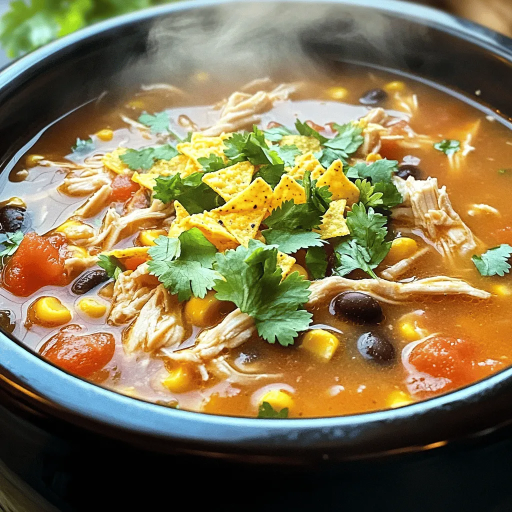 - 1 lb boneless, skinless chicken breasts - 1 medium onion, chopped - 2 cloves garlic, minced - 1 can (14.5 oz) diced tomatoes with green chilies - 1 can (15 oz) black beans, drained and rinsed - 1 can (15 oz) corn, drained - 4 cups chicken broth - 1 tablespoon ground cumin - 1 tablespoon chili powder - 1 teaspoon smoked paprika - Salt and pepper to taste To make this soup, I start with chicken breasts that are boneless and skinless. They cook tenderly in the slow cooker. I chop one medium onion and mince two cloves of garlic. These add great flavor. I use canned goods, too. A 14.5 oz can of diced tomatoes with green chilies brings spiciness. I also add one 15 oz can of black beans and one 15 oz can of corn. For the broth, I pour in four cups of chicken broth. I season the soup with one tablespoon of ground cumin, one tablespoon of chili powder, and one teaspoon of smoked paprika. Finally, I add salt and pepper to taste. These spices give the soup a warm, rich flavor. - Fresh cilantro - Lime - Tortilla chips for serving After cooking, I like to garnish the soup. Fresh cilantro adds a bright touch. A squeeze of lime gives it a nice zing. I enjoy serving the soup with crunchy tortilla chips, too. They add texture and fun to every spoonful. 1. Start by placing the chicken breasts at the bottom of your slow cooker. This helps keep the chicken moist. 2. Next, add the chopped onion and minced garlic on top of the chicken. These add great flavor. 3. Pour in the diced tomatoes with green chilies, black beans, and corn. Each adds a nice texture and taste. 4. Now, pour the chicken broth over all the ingredients. This creates a rich base for the soup. 5. Sprinkle the ground cumin, chili powder, smoked paprika, salt, and pepper evenly over everything. This step is key for that bold flavor. - Cook on low for 6-8 hours or on high for 3-4 hours. Cooking on low gives a deeper flavor. - About 30 minutes before serving, use two forks to shred the chicken while it’s still in the slow cooker. This makes it easier to mix with the soup. - After shredding, stir in the lime juice. This brightens up the soup and adds a fresh taste. - Serve the soup hot, garnished with fresh cilantro. This adds a lovely color and flavor. - Top each bowl with a handful of tortilla chips for extra crunch. - Pair your soup with a side of avocado or a refreshing drink like iced tea. This balances the meal perfectly. To make your soup taste great, adjust the seasoning to your liking. After cooking, taste the soup. You might want to add more salt or spices. This will enhance the flavor and make it more enjoyable. For chicken tenderness, use boneless, skinless chicken breasts. Cook them low and slow. This keeps the chicken juicy. Shred the chicken in the slow cooker about 30 minutes before serving. This lets the meat soak up more flavor. Choose the right slow cooker size for your meal. A 6-quart slow cooker works well for this recipe. It holds all the ingredients without overflowing. If you use a smaller one, it might not fit everything. Avoid common slow cooker mistakes. Don’t lift the lid too often while cooking. This lets heat escape and can slow down cooking. Always make sure your ingredients are covered with liquid for even cooking. {{image_2}} You can easily switch up the protein in this soup. Instead of chicken, try turkey. Ground turkey works well and cooks quickly. If you want a meatless option, use beans. Black beans are great, but you can also use pinto or chickpeas. For a vegetarian or vegan twist, leave out all meat. Add more veggies, like zucchini or bell peppers, for texture. You could also use vegetable broth instead of chicken broth. This keeps the soup flavorful without meat. Want to spice things up? Add more heat! Try extra chili powder or diced jalapeños. If you prefer a milder flavor, use less spice at first. You can always add more later. Incorporating different vegetables can also change the soup's flavor. Consider adding diced carrots or corn. You can even throw in some spinach for a nutrient boost. Just add them during the last hour of cooking to keep them fresh. To keep your soup fresh, use airtight containers. Glass containers are a great choice. They do not stain and keep flavors well. You can also use plastic containers. Just make sure they seal tight. Store your soup in the fridge for up to three days. If you want to keep it longer, freeze it. It can last up to three months in the freezer. Just remember to let it cool before you store it. Reheat your soup on the stovetop for the best flavor. Pour the soup into a pot and heat over medium. Stir it often to warm it evenly. You can also use the microwave. Pour the soup into a bowl and cover it. Heat for 1-2 minutes, stirring halfway through. Check the temperature before serving. To keep the flavor and texture, avoid boiling the soup. This helps keep the chicken tender and the broth rich. You can store this soup in the fridge for up to four days. Make sure to use an airtight container. This helps keep the soup fresh and tasty. Yes, you can freeze Slow Cooker Chicken Tortilla Soup. Place it in a freezer-safe container. It will last for up to three months in the freezer. Just remember to leave some space in the container for expansion. I love serving this soup with tortilla chips for crunch. You can also add avocado slices or fresh lime on top. A side salad or cornbread works well too. Yes, you can use frozen chicken in the slow cooker. It will take longer to cook, about 8-10 hours on low. Always ensure the chicken reaches a safe internal temperature of 165°F before serving. This blog post showed how to make delicious Slow Cooker Chicken Tortilla Soup. We covered the main ingredients and prep steps to build flavor. You learned cooking times and best ways to serve. I shared tips for perfecting the recipe and variations to suit your taste. Finally, I included storage tips for leftovers and answered common questions. Remember, this soup is easy to adapt, so fee