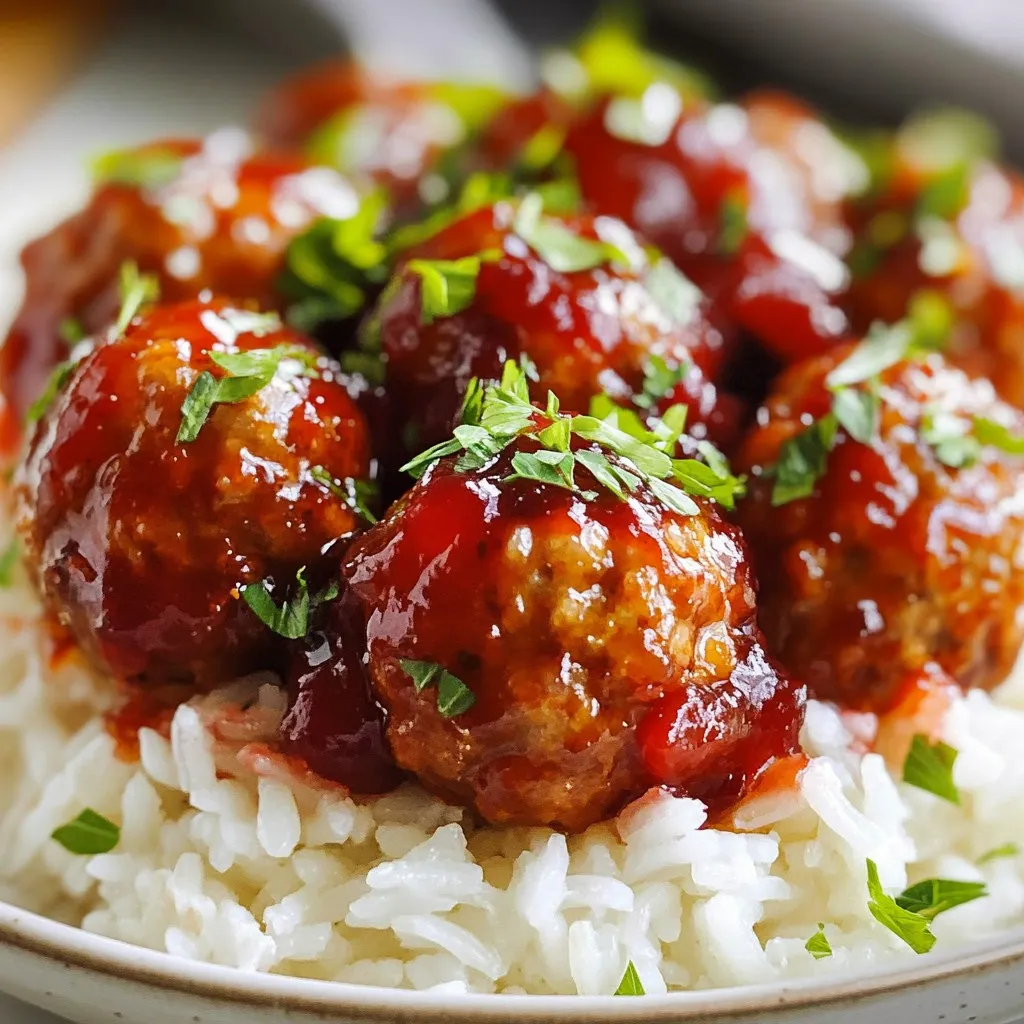 Serve the meatballs on a bed of fluffy rice or mashed potatoes, drizzled with extra cranberry sauce, and garnish with fresh parsley for a pop of color.