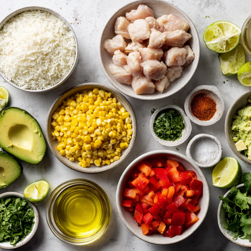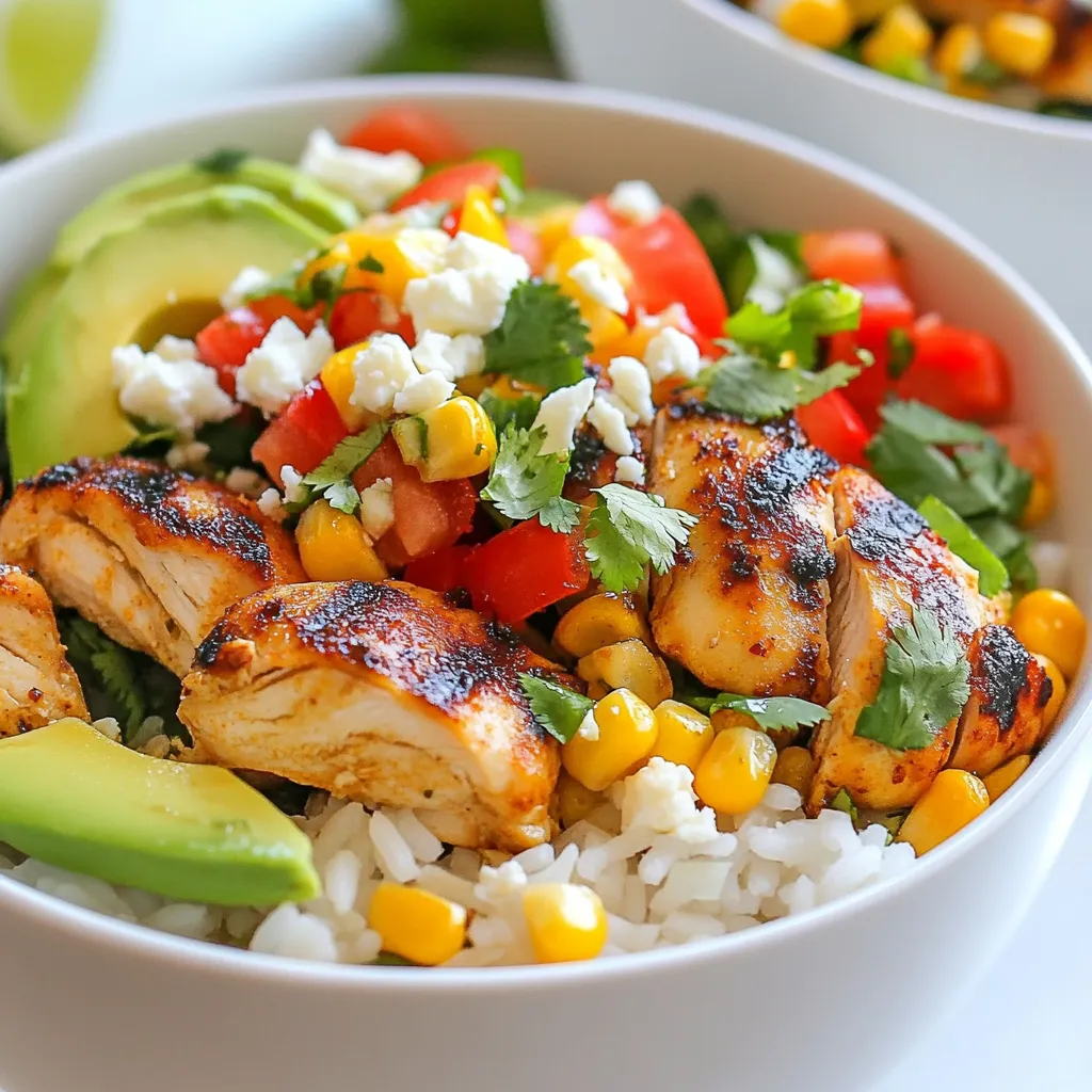 To make the perfect Street Corn Chicken Rice Bowls, start with the main ingredients. You can choose jasmine or basmati rice for a fluffy base. The chicken thighs add rich flavor and stay moist. I prefer boneless, skinless thighs for easy cooking. Fresh corn gives a sweet crunch. Red bell pepper adds color and a slight sweetness. Avocado brings creaminess, while feta cheese adds a salty kick. Fresh cilantro brightens up the dish. Don’t forget lime juice for zest and a touch of olive oil for cooking.