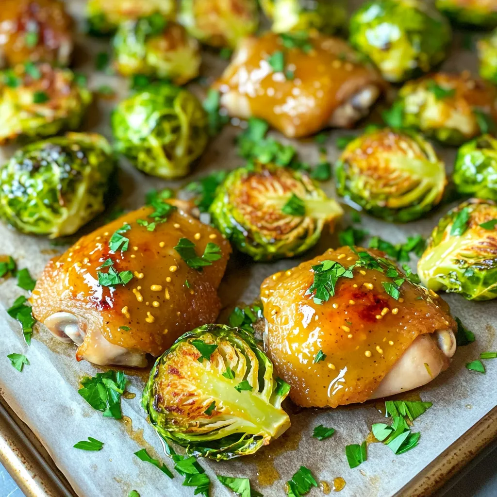 - 4 boneless, skinless chicken thighs - 1 lb Brussels sprouts, trimmed and halved - 3 tablespoons honey - 3 tablespoons Dijon mustard - 2 tablespoons olive oil - 3 cloves garlic, minced - 1 teaspoon smoked paprika - Salt and pepper to taste - Fresh parsley, chopped for garnish Gathering the right ingredients is key to making this dish shine. First, you need chicken thighs. I love using boneless and skinless thighs because they stay juicy and tender during cooking. You’ll also want fresh Brussels sprouts. Trim them and cut them in half. This helps them cook evenly and soak up flavor. Next, you’ll need honey and Dijon mustard. These two ingredients create that sweet and tangy glaze you’ll love. Don’t forget the olive oil! It helps the chicken and Brussels sprouts roast beautifully. For seasoning, garlic adds a nice kick. Smoked paprika gives a warm, earthy flavor. Salt and pepper are must-haves for basic seasoning. Finally, fresh parsley adds a pop of color and freshness when you serve the dish. Each ingredient plays an important role in creating a balanced, delicious meal. 1. Preheat your oven to 400°F (200°C). This high heat helps cook the chicken and Brussels sprouts perfectly. 2. In a small bowl, mix honey, Dijon mustard, olive oil, minced garlic, smoked paprika, salt, and pepper. Whisk until smooth. This mixture is your honey mustard marinade. 1. In a large bowl, add the chicken thighs. Pour half the honey mustard marinade over them. Toss well to coat each piece. 2. On a large baking sheet lined with parchment paper, place the marinated chicken thighs on one side. 3. On the other side, add the halved Brussels sprouts. Drizzle the remaining marinade over them and toss to coat evenly. 4. Spread the chicken and Brussels sprouts out on the sheet. This helps them roast evenly. 1. Bake in the preheated oven for 25-30 minutes. Check that the chicken reaches an internal temperature of 165°F (75°C). The Brussels sprouts should be golden and tender. 2. When done, take the sheet pan out of the oven. Let the dish rest for a few minutes. This helps the juices settle. 3. Before serving, sprinkle fresh parsley on top for a bright finish. To ensure your chicken is juicy, pay attention to its internal temperature. Aim for 165°F (75°C). Use a meat thermometer to check this. For marination, let the chicken soak for at least 30 minutes. If you have more time, marinate for up to 4 hours in the fridge. This helps the flavors to really soak in. Caramelization adds great flavor. To achieve this, roast your Brussels sprouts until they are brown and tender. Spread them out on the pan. This helps them cook evenly. For trimming, cut off the tough ends and then slice each sprout in half. This simple step ensures they cook faster and absorb more flavor. Pair this dish with fluffy rice or a fresh salad. Both add nice balance to the meal. For garnishing, sprinkle chopped parsley on top just before you serve. This adds color and freshness. You can also add a squeeze of lemon for a touch of brightness. Enjoy your meal! {{image_2}} You can easily change the taste of this dish. Try adding spices like thyme or rosemary. A sprinkle of chili flakes can give it a nice kick. For herbs, fresh dill or cilantro works great. You can also mix up the marinade. Swap honey for maple syrup for a different sweet taste. Or use whole grain mustard for added texture and flavor. Feel free to add other veggies to the pan. Carrots, sweet potatoes, or green beans can work well. For seasonal variations, think about using butternut squash in the fall. In the summer, zucchini and bell peppers add a nice touch. Just cut them into similar sizes for even cooking. If you want to switch from chicken thighs, try chicken breasts or drumsticks. You can even use turkey thighs for a leaner option. If using different proteins, adjust cooking times. Chicken breasts may cook faster, around 20-25 minutes. If you use pork or beef, check for doneness with a meat thermometer. Aim for safe internal temperatures of 165°F (75°C) for chicken and 145°F (63°C) for pork. You can store leftovers in the fridge for up to three days. Use an airtight container to keep them fresh. This helps prevent strong smells and moisture loss. When reheating, make sure the chicken reaches 165°F (75°C) to ensure it's safe to eat. Yes, you can freeze the cooked dish. Let it cool completely before packing. Use freezer-safe bags or containers for best results. To thaw, place it in the fridge overnight. For reheating, use an oven at 350°F (175°C) until heated through. This keeps the chicken juicy and the Brussels sprouts tender. To check if chicken is cooked through, use a meat thermometer. Insert it into the thickest part of the chicken. The safe internal temperature should be 165°F (75°C). If you don’t have a thermometer, cut into the chicken. It should be white and juices should run clear. This method works but can be less precise. Always aim for that 165°F mark for safety. Yes, you can use bone-in chicken. Bone-in pieces take longer to cook. You should increase the baking time to about 35-40 minutes. Always check the internal temperature with a meat thermometer. It should still reach 165°F (75°C). For best results, keep the marinade the same for great flavor. Many sides pair well with this dish. Here are some tasty options: - Roasted potatoes: Their soft texture complements the chicken well. - Green beans: They add a nice crunch and color to the plate. - Quinoa salad: This provides a healthy and filling side. - Mixed greens salad: A fresh salad balances the meal nicely. These sides will enhance your dining experience and make your meal more complete. In this article, we explored how to make a delicious sheet pan honey mustard chicken with Brussels sprouts. We covered the main ingredients and seasoning, plus steps for preparation and cooking. I shared tips for perfecting the chicken and Brussels sprouts, along with serving suggestions. You can also customize 