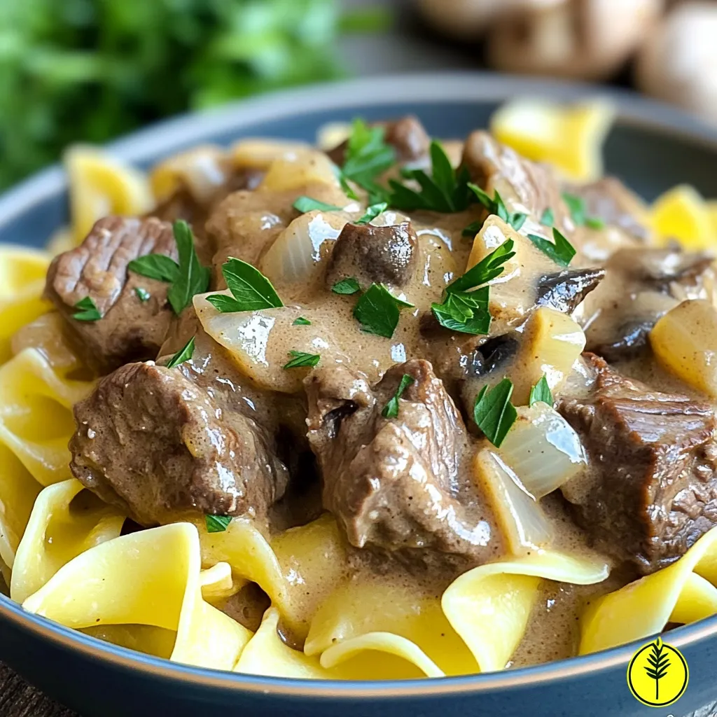 - 2 lbs beef stew meat, cut into bite-sized chunks - 1 medium onion, diced - 3 cloves garlic, minced - 8 oz mushrooms, sliced - 2 cups beef broth The base of this dish is the beef stew meat. Look for good quality cuts. Dicing the onion and mincing the garlic adds a strong flavor. Mushrooms give a nice earthy tone. The beef broth ties everything together, making the sauce rich. - 1 tablespoon Worcestershire sauce - 1 teaspoon Dijon mustard - 1 teaspoon paprika - 1 teaspoon dried thyme - Salt and pepper to taste These seasonings bring the dish to life. Worcestershire sauce and Dijon mustard add depth. Paprika gives a hint of warmth. Dried thyme adds a lovely herbal note. Adjust salt and pepper to suit your taste. - 1 cup sour cream - 2 tablespoons all-purpose flour - 2 tablespoons olive oil - 12 oz egg noodles Sour cream adds creaminess to the sauce. Flour helps to thicken it. Olive oil is key for searing the beef. Egg noodles are perfect for serving. They soak up the rich sauce well and complete the meal. First, heat the olive oil in a large skillet over medium-high heat. Once the oil is hot, add the beef stew meat. Sear the beef for about 5 to 7 minutes. You want it browned on all sides. This step gives great flavor. After searing, transfer the beef to your slow cooker. In the same skillet, add the diced onion and minced garlic. Sauté them for about 3 to 4 minutes. You want them soft and translucent. Next, add the sliced mushrooms. Cook until they begin to brown, stirring often. Once done, pour these vegetables over the beef in the slow cooker. Now, it’s time to add some tasty ingredients. Pour in the beef broth and add the Worcestershire sauce, Dijon mustard, paprika, thyme, salt, and pepper. Stir everything well to combine. Cover the slow cooker and cook it on low for about 6 to 8 hours. If you're in a hurry, you can cook it on high for 3 to 4 hours. The beef will be tender when it’s ready. Once cooking is complete, take a small bowl. Mix together the sour cream and flour until smooth. Gradually add this mixture to the slow cooker, stirring well. This helps thicken the sauce. Cook on high for an additional 30 minutes. This gives you that rich and creamy texture. While the stroganoff finishes, cook the egg noodles according to the package instructions. Drain them and set aside. To serve, place a bed of egg noodles on each plate. Top with the beef stroganoff. If you like, garnish with fresh parsley for a pop of color. Enjoy your meal! Searing the beef is key. It adds great flavor and color. Heat olive oil in a skillet over medium-high heat. Brown the beef on all sides for about 5-7 minutes. This step makes your stroganoff rich and tasty. Cook time matters. I suggest setting the slow cooker on low for 6-8 hours. If you’re short on time, use high for 3-4 hours. Always check for tenderness before serving. If you need a sour cream alternative, try Greek yogurt. It gives a similar creamy texture. You can also use cream cheese mixed with milk. For gluten-free noodles, use rice noodles or gluten-free pasta. Both options work well and keep your meal delicious. Want to boost flavor? Add extra spices like garlic powder or onion powder. Fresh herbs like parsley or thyme also make a big difference. You can mix in vegetables too. Try peas, carrots, or bell peppers. If you want more protein, add cooked chicken or even tofu for a fun twist. {{image_2}} You can switch the beef for other meats. Chicken works well and cooks fast. Use boneless chicken thighs for more flavor. Pork is another great choice. Look for pork shoulder or tenderloin. If you want a vegetarian option, try mushrooms and lentils. This mix gives a hearty texture without meat. For a low-carb version, skip the egg noodles. Try zucchini noodles or spaghetti squash instead. These options keep it light and fresh. If dairy is a concern, use coconut cream instead of sour cream. It gives a nice creaminess without the milk. To add a twist, try Asian flavors. Soy sauce can replace Worcestershire sauce. Add ginger and green onions for a fresh taste. For an Italian flair, mix in some oregano and basil. A splash of red wine can also deepen the flavor. Each twist makes this dish unique and fun to eat. To keep your beef stroganoff fresh, cool it down first. Let it sit at room temperature for no more than two hours. Once cool, use airtight containers for storing. Glass or plastic containers with tight lids work best. These will help keep the flavors intact and prevent spills. You can freeze beef stroganoff for later use. First, let the dish cool completely. Then, pour it into freezer-safe bags or containers. Remove as much air as possible to avoid freezer burn. When you're ready to eat, thaw it in the fridge overnight. To reheat, warm it on the stove over low heat, stirring often. If the sauce looks thick, add a splash of beef broth to loosen it. In the refrigerator, your beef stroganoff lasts about three to four days. If you freeze it, it can stay good for about three months. Always check for any off smells or colors before eating. Enjoy your meal knowing it can last a bit longer! You can tell the beef is tender when it pulls apart easily with a fork. The meat will look juicy and have a rich color. If it feels soft and not chewy, it is ready. Typically, this takes about 6-8 hours on low heat or 3-4 hours on high. The low and slow method helps break down tough fibers in the meat. Trust your senses; the smell will also tell you when it’s almost done. Yes, you can make this dish ahead of time. Prepare the beef and sauce, then let it cool. Store it in an airtight container in the fridge. You can keep it for up to three days. When you’re ready to eat, just reheat it on the stove or in the slow cooker. This makes meal prepping easy and saves time during busy days. Several side dishes pair well with beef stroganoff. Here are some great options: - Steamed green beans: They add a nice crunch. - Garlic bread: Perfect for soaking up the sauce. - Simpl